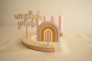 Unser 3D Regenbogen aus Holz und Acryl ist ein echtes Highlight auf deinem Geburtstagstisch. Durch die Kombination aus natürlichem Holz und farbigem Acryl entsteht eine besondere Tiefe, die sofort ins Auge fällt. Der Regenbogen bringt moderne Leichtigkeit in deine Dekoration und passt perfekt in jedes Geburtstags-Setup.