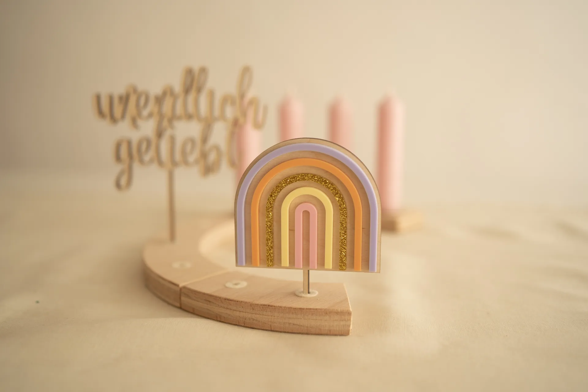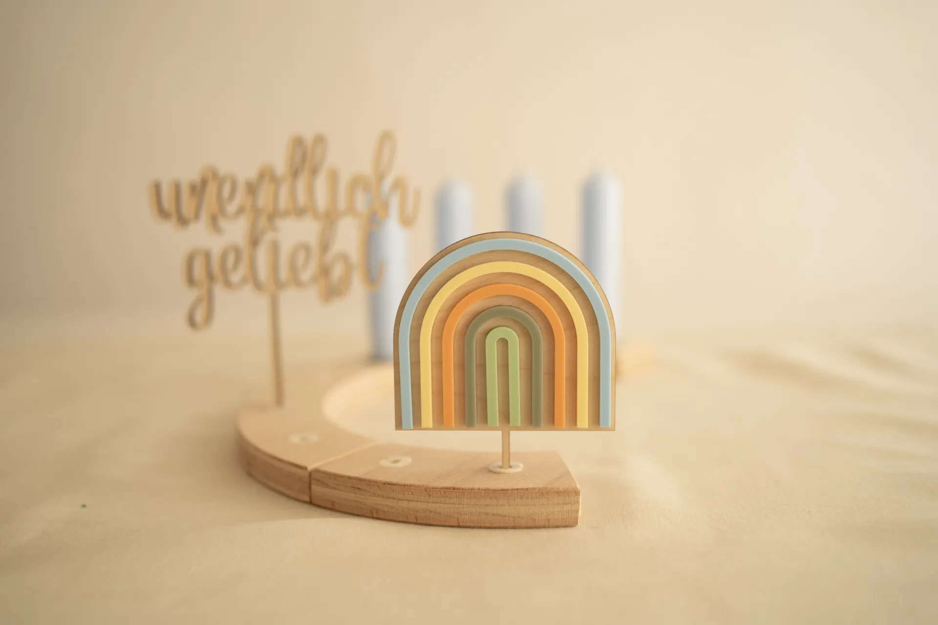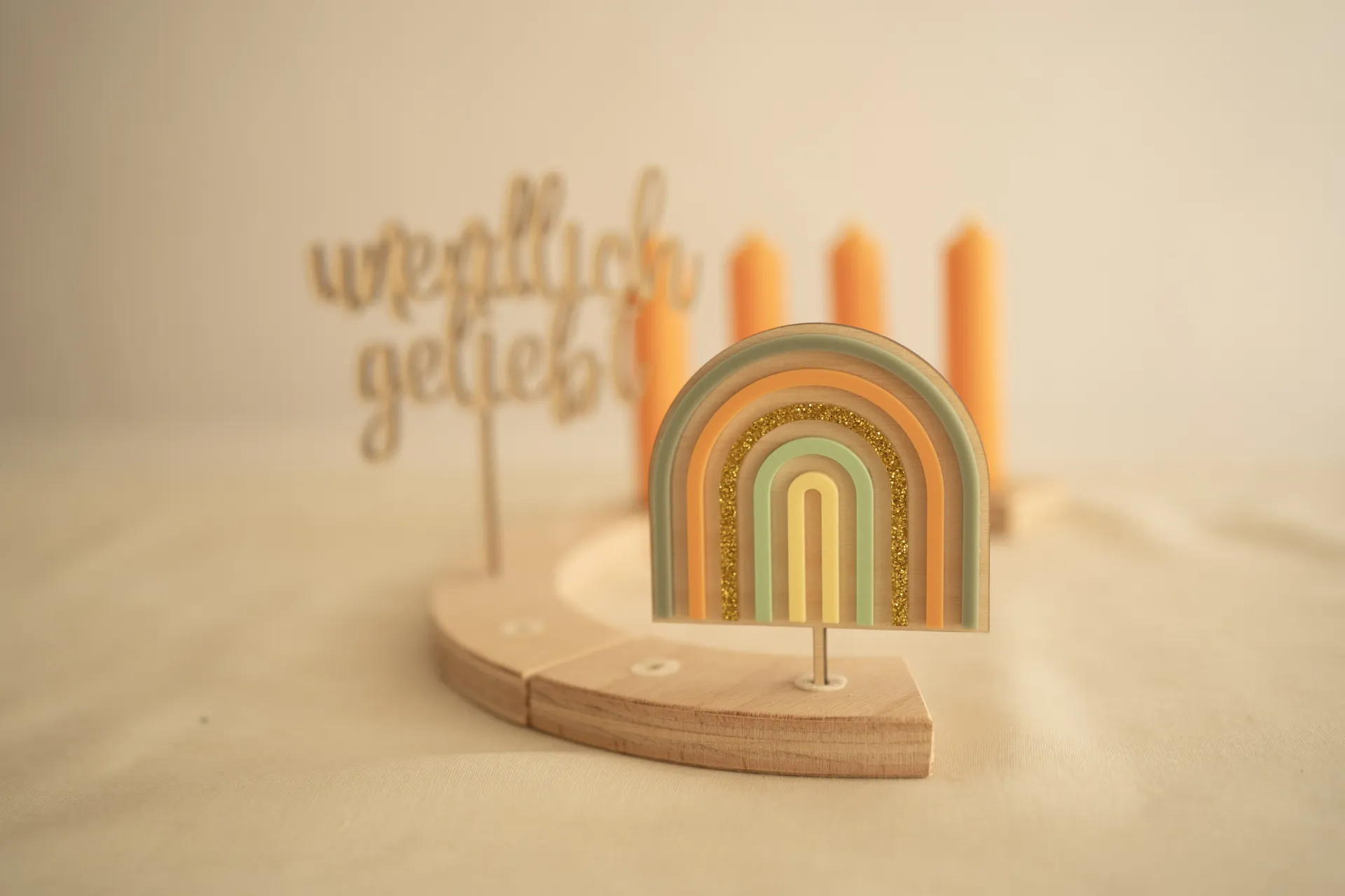 Unser 3D Regenbogen aus Holz und Acryl ist ein echtes Highlight auf deinem Geburtstagstisch. Durch die Kombination aus natürlichem Holz und farbigem Acryl entsteht eine besondere Tiefe, die sofort ins Auge fällt. Der Regenbogen bringt moderne Leichtigkeit in deine Dekoration und passt perfekt in jedes Geburtstags-Setup.
