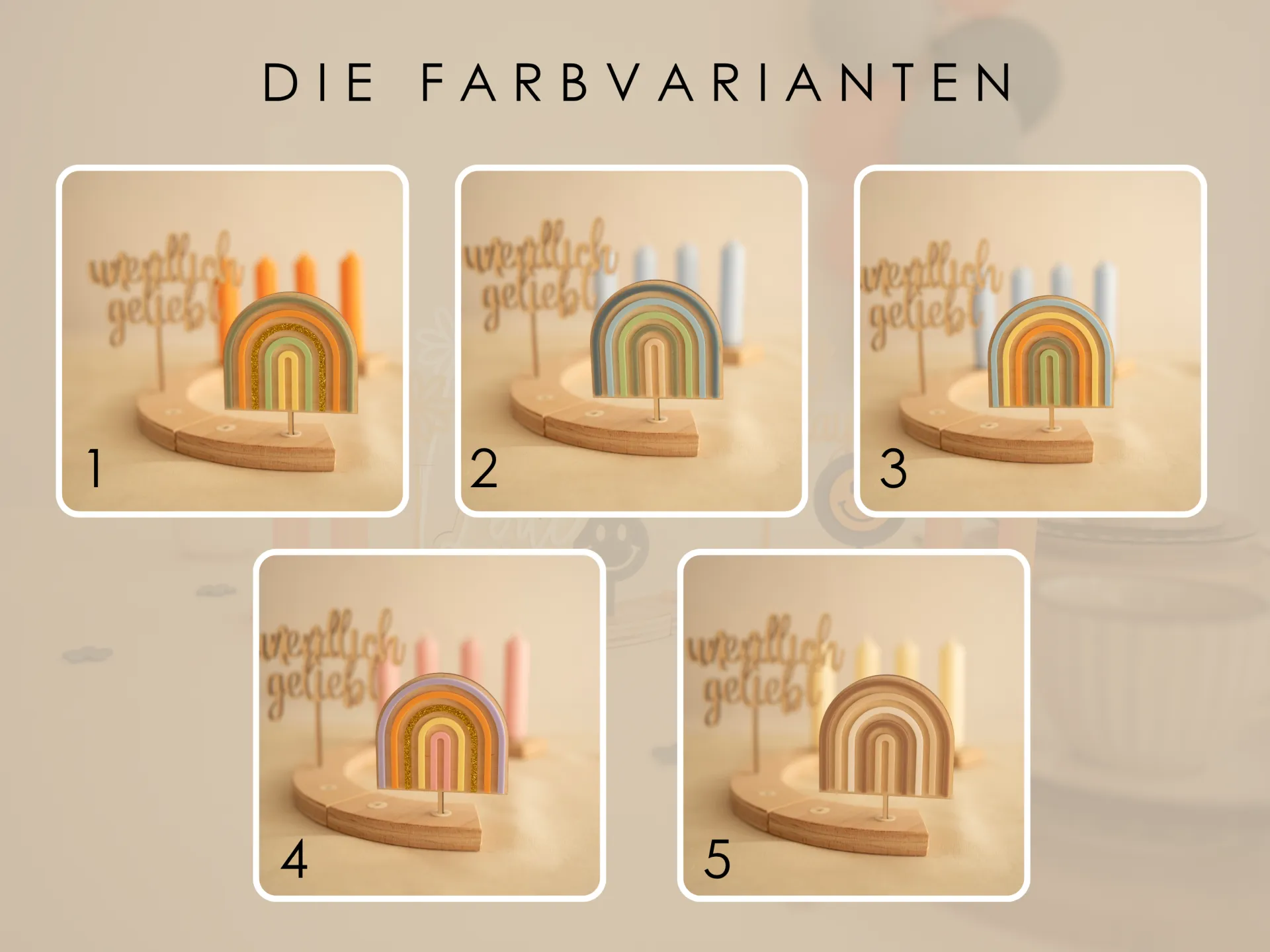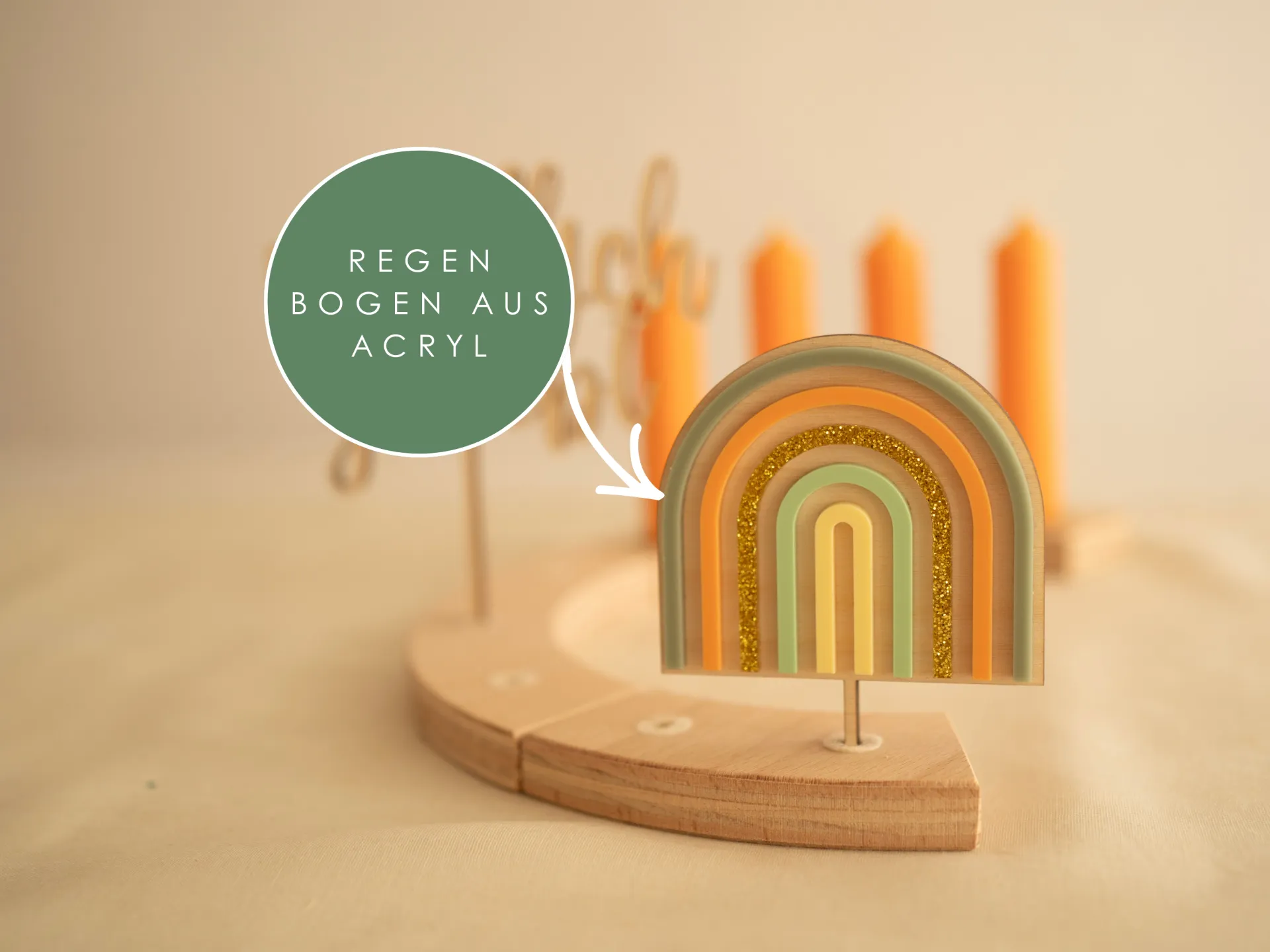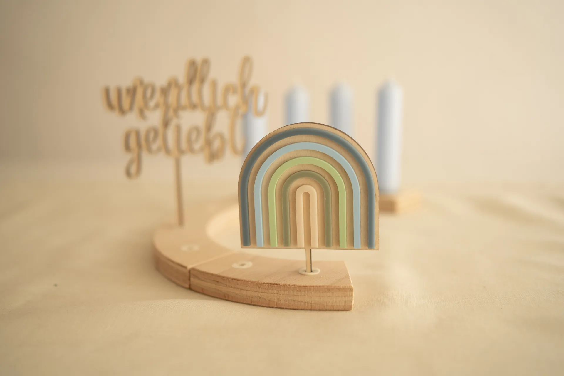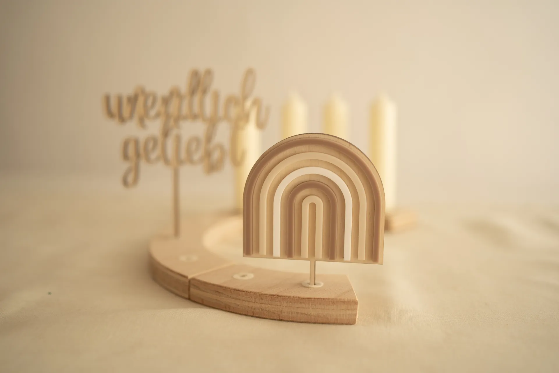 Unser 3D Regenbogen aus Holz und Acryl ist ein echtes Highlight auf deinem Geburtstagstisch. Durch die Kombination aus natürlichem Holz und farbigem Acryl entsteht eine besondere Tiefe, die sofort ins Auge fällt. Der Regenbogen bringt moderne Leichtigkeit in deine Dekoration und passt perfekt in jedes Geburtstags-Setup.