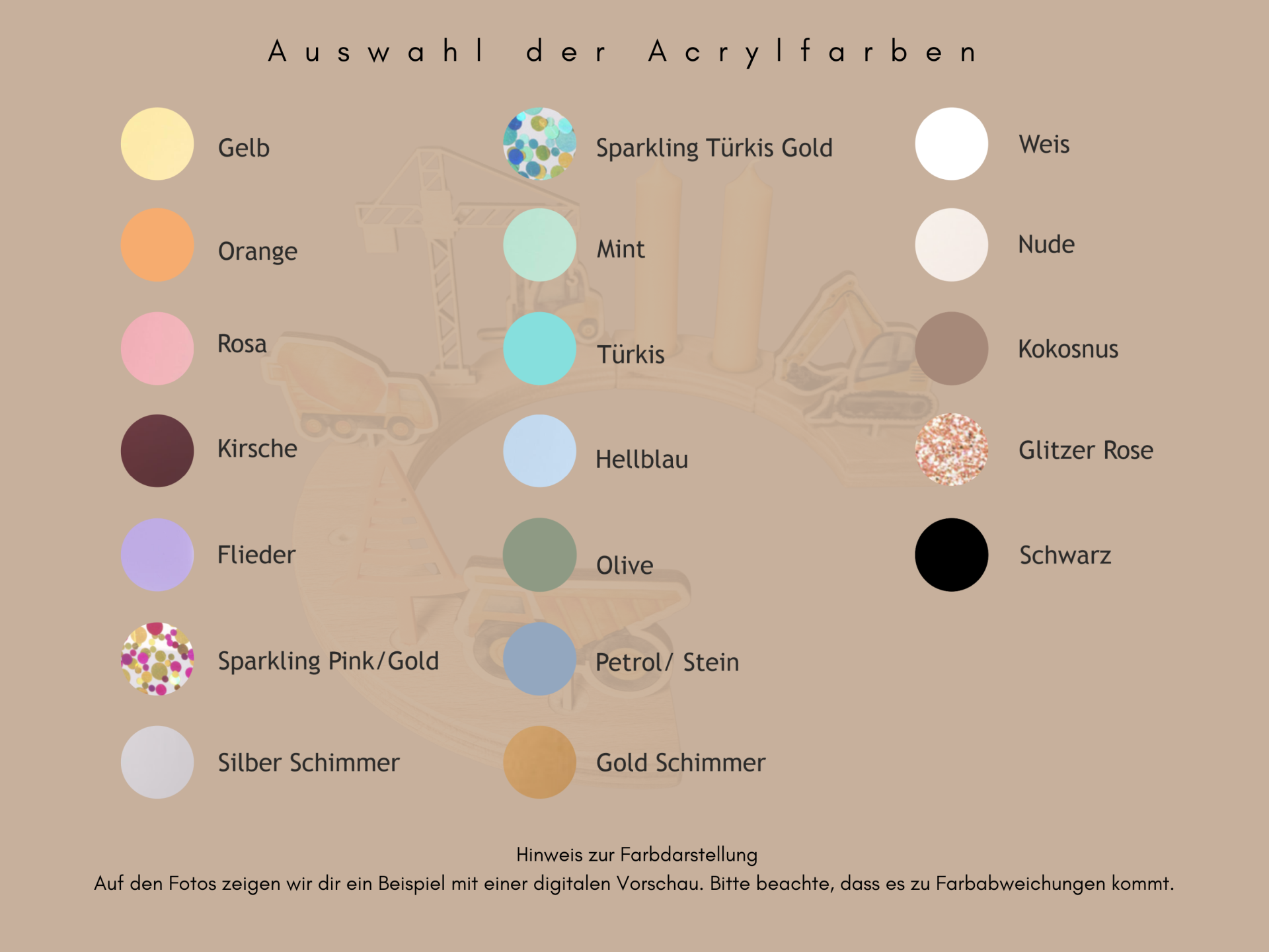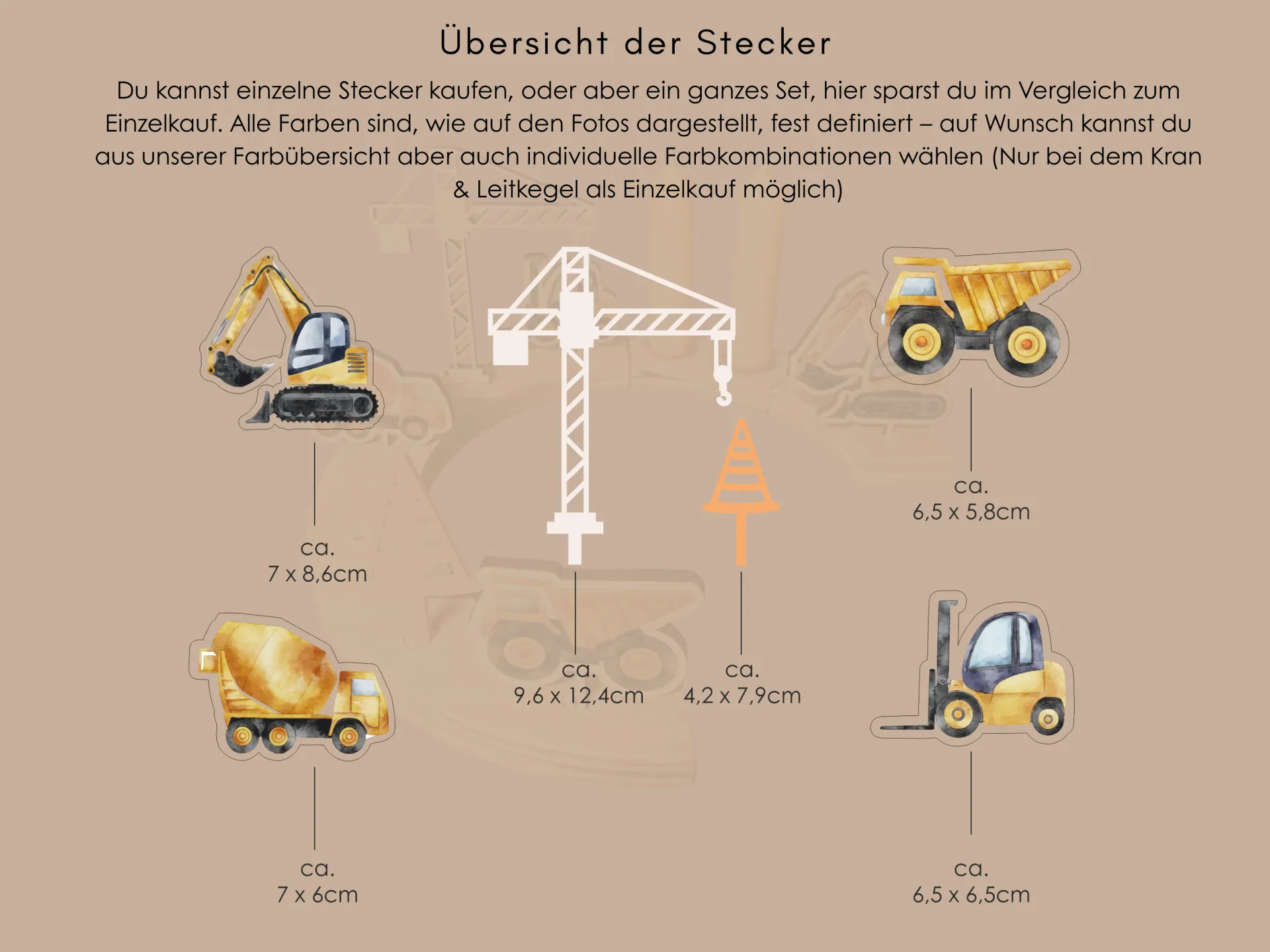 Die Farben der Acrylstecker sind, wie auf den Fotos abgebildet, festgelegt – du kannst sie aber auf Wunsch anpassen. Wähle dafür aus unserer Farbübersicht (siehe Produktbilder) und stimme das Set auf deine Wünsche ab. Alle Motive sind einzeln bestellbar – im Set sparst du dabei gegenüber dem Einzelpreis. So kannst du ganz flexibel entscheiden, wie du die Baustellen-Party dekorieren möchtest.
