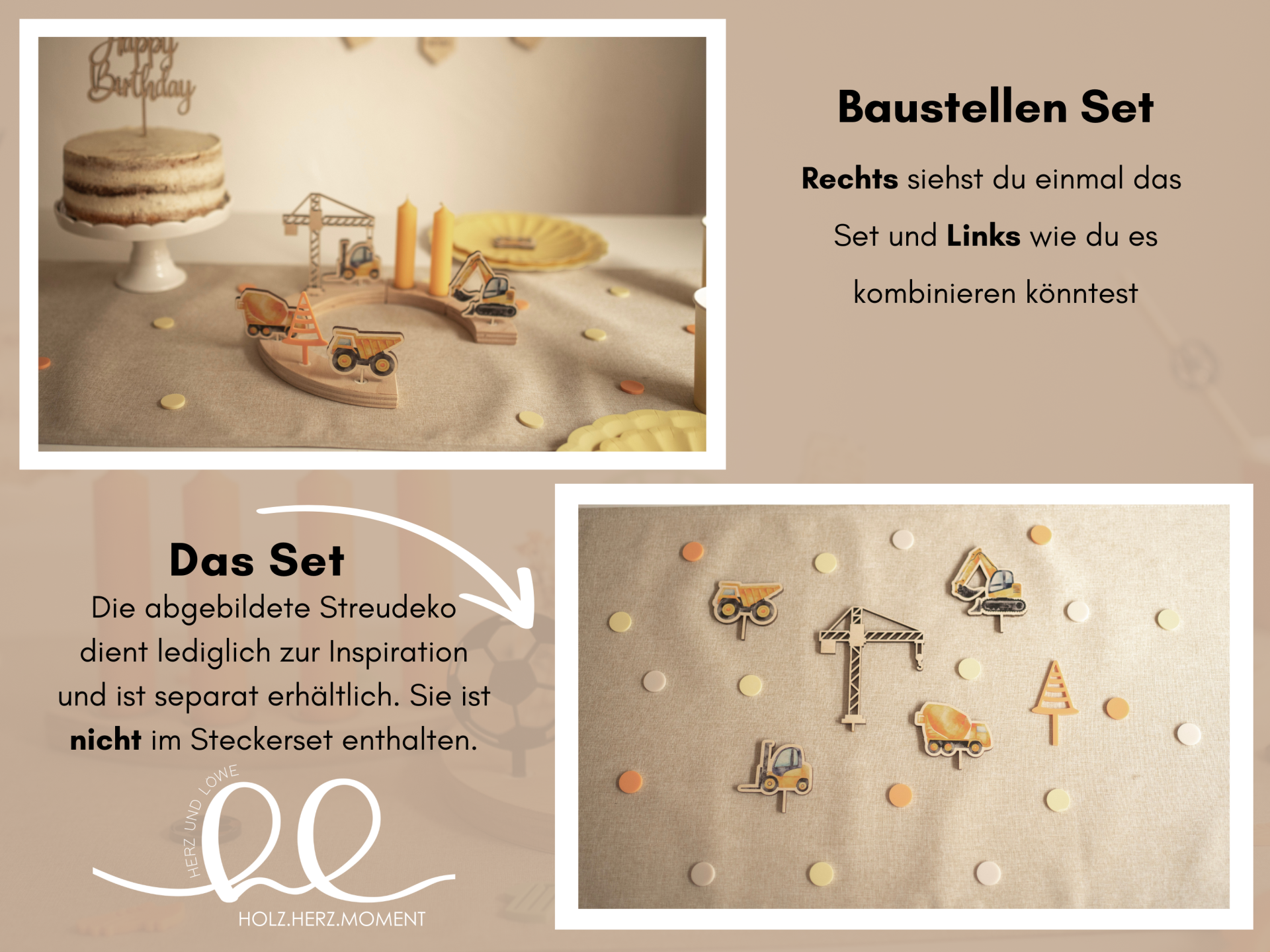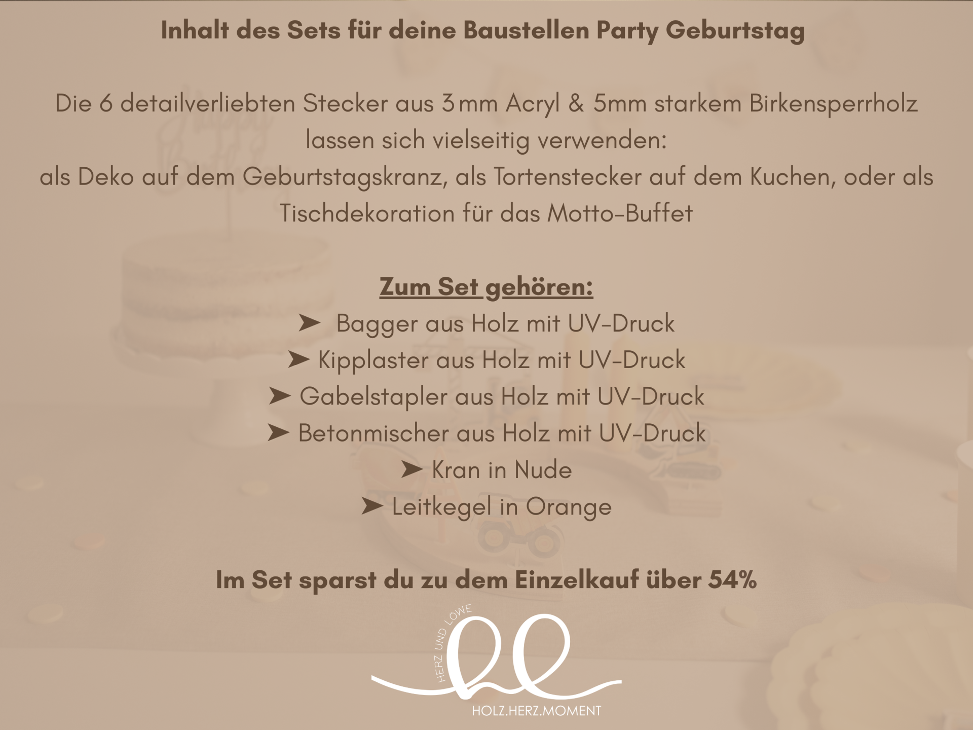 Kleine Bauleiter ganz groß – mit unserer liebevoll gestalteten Baustellen Partydeko aus Holz & Acryl wird jeder Geburtstag zum Abenteuer. Unser Baustellen Deko Set für Kindergeburtstag ist die perfekte Wahl für kleine Fahrzeug-Fans. Mit Steckern aus Holz und Acryl, die detailreich per UV-Druck veredelt sind, entsteht im Nu eine kreative und kindgerechte Festtafel.