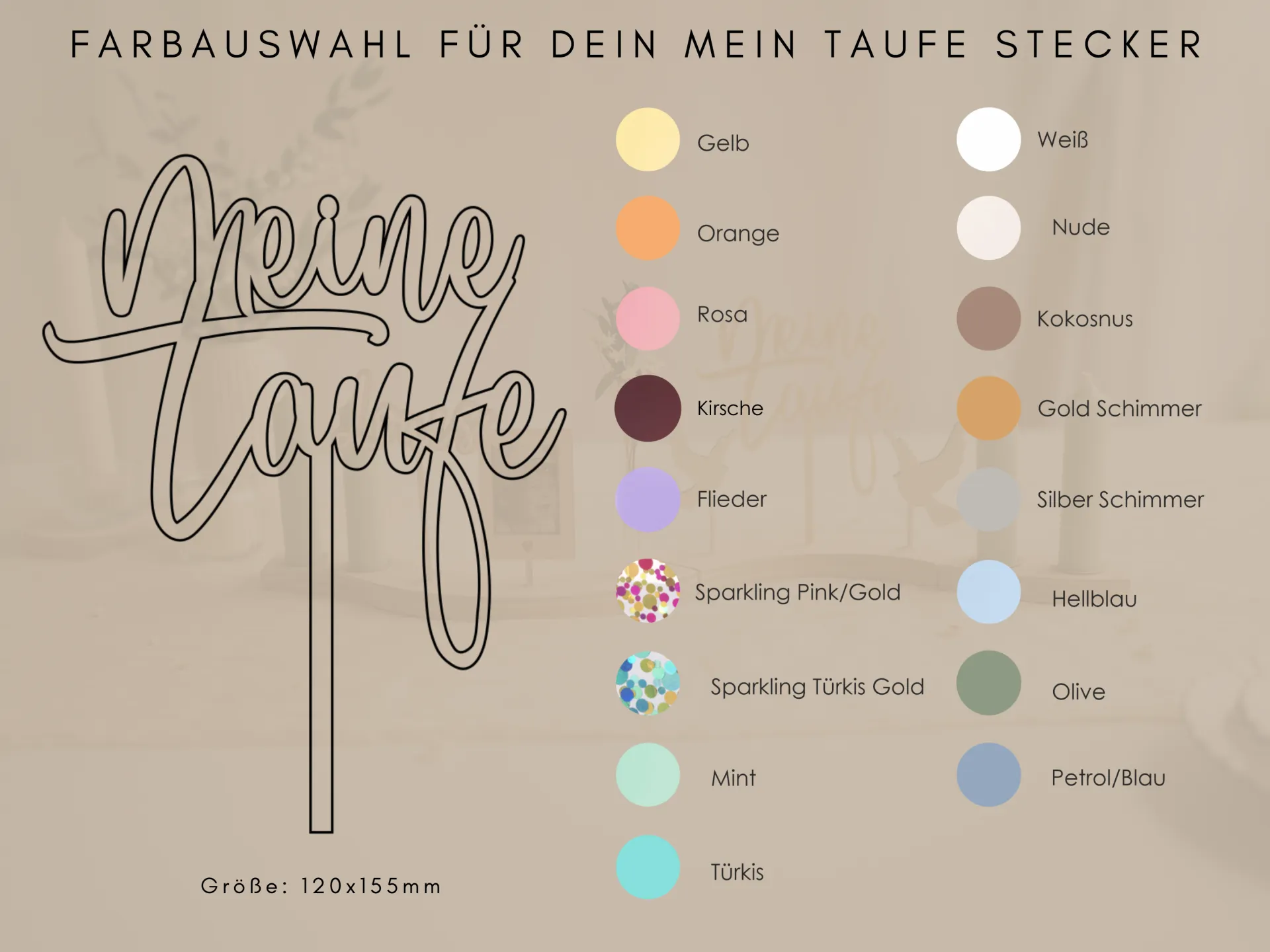 Du möchtest den “Meine Taufe”-Stecker lieber in Holz, statt Acryl? Oder hast einen bestimmten Farbwunsch für den Namensstecker? Bei Wünschen, Anregungen oder Fragen stehen wir dir jederzeit zur Verfügung.
