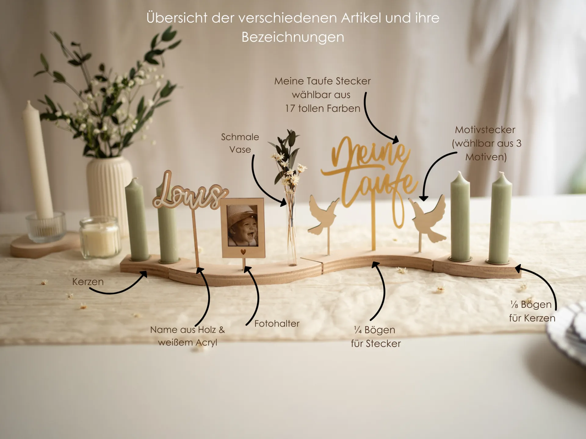 Du steckst mitten in den Vorbereitungen für die Taufe deines Kindes und suchst noch nach der passenden Dekoration? Unsere nachhaltige Tischdeko zur Taufe hast du bestimmt so noch nicht gesehen. Vielseitig, wiederverwendbar, zeitlos – dieses wundervolle Set aus Bögen und individuellen Holz- und Acrylsteckern kombiniert die natürliche Wärme des Holzes mit verspielten Details – und deine Gäste werden genauso beeindruckt sein, wie du!