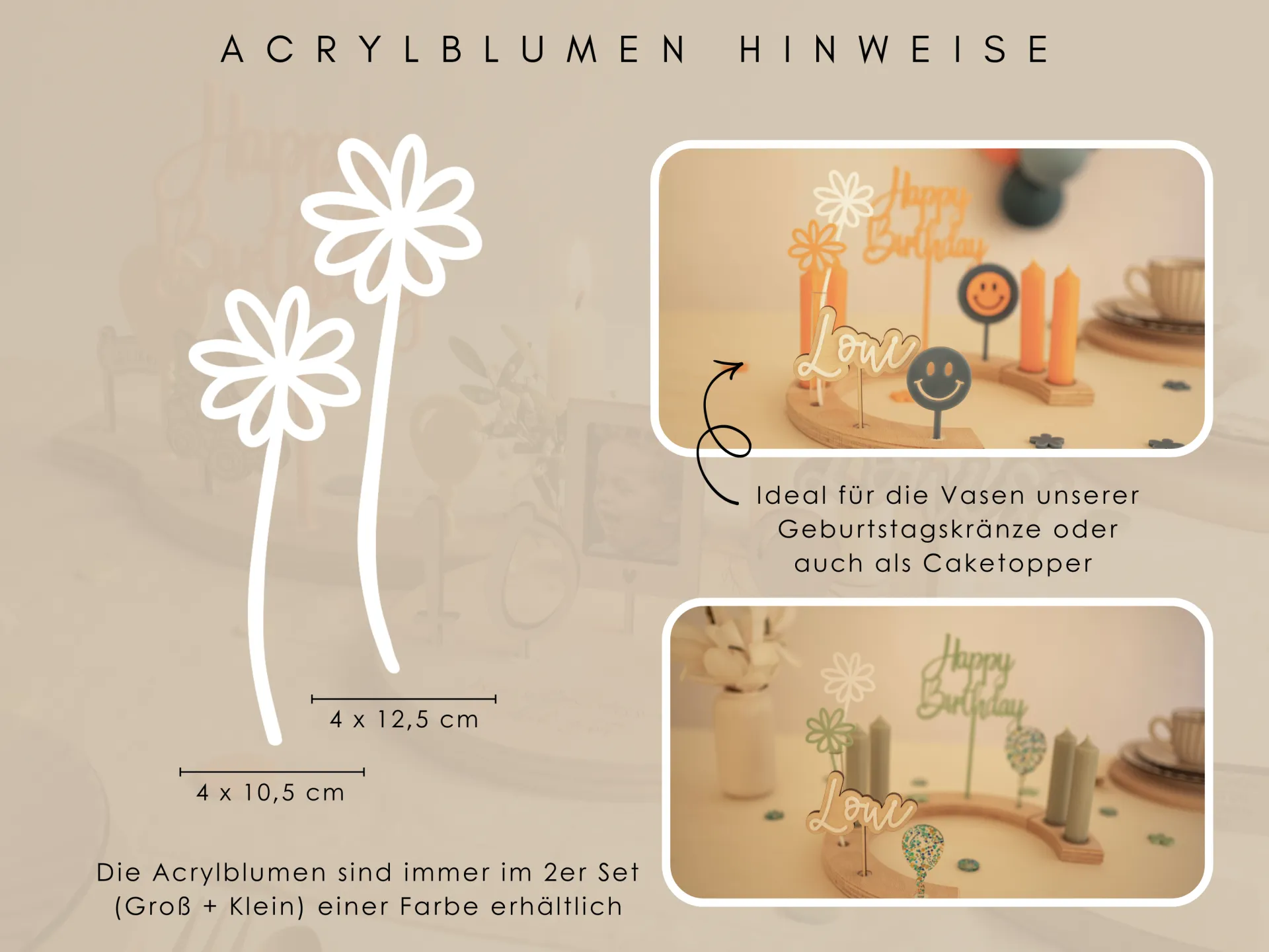 Manchmal sind es die kleinen Dinge, die den Alltag heller machen. Unsere Acrylblumen sind genau dafür gemacht: Sie setzen einen farbenfrohen Akzent, ohne laut zu sein, und begleiten euch durch viele kleine Familienmomente. Das Set besteht aus zwei bunten Acrylblumen in unterschiedlichen Größen. Eine ist etwas kleiner, eine etwas größer – genau diese Kombination macht sie so lebendig und harmonisch. Sie passen perfekt in die Vasen unserer Geburtstagskränze, machen sich aber genauso schön als dezente Deko im Alltag.