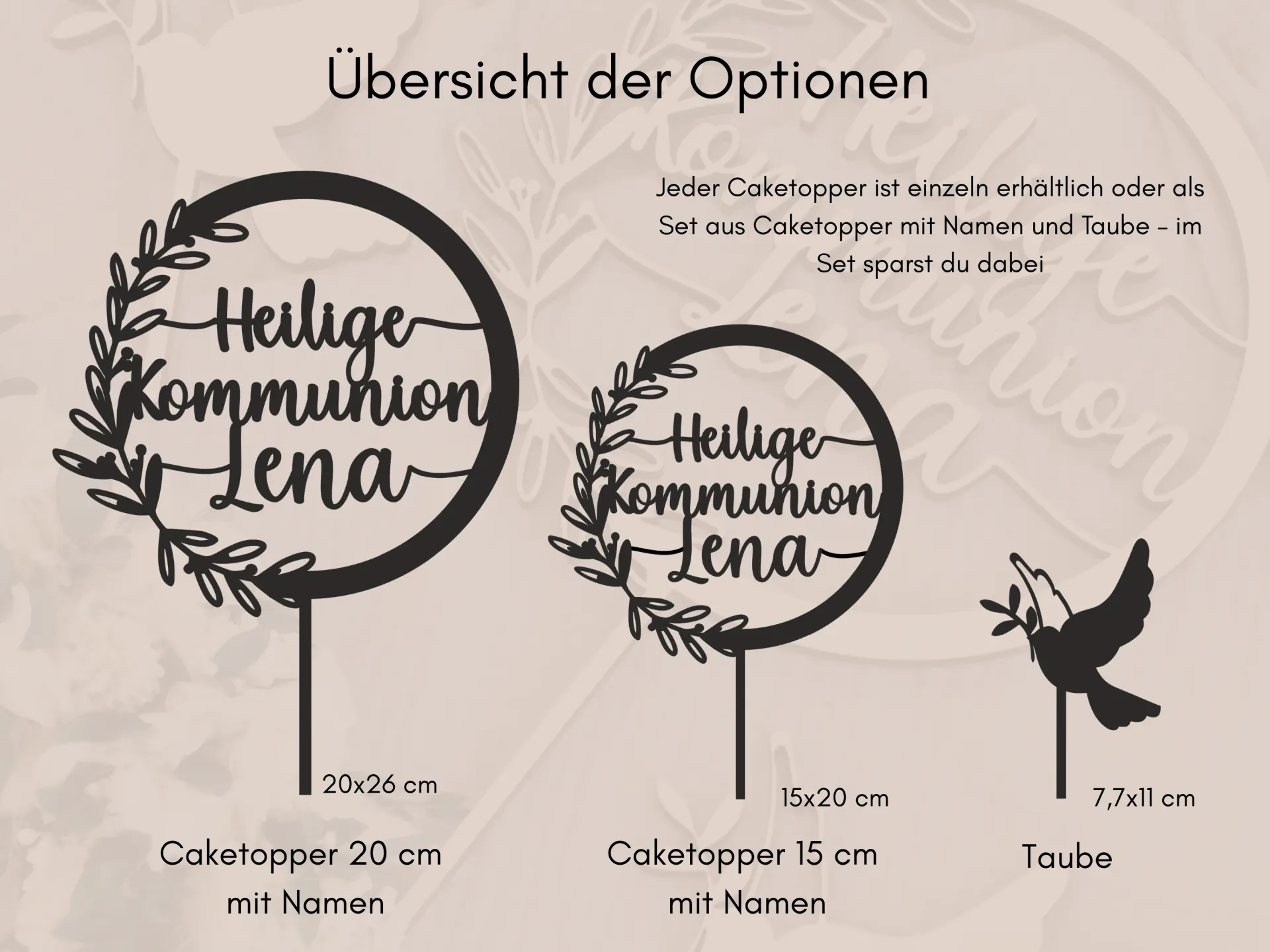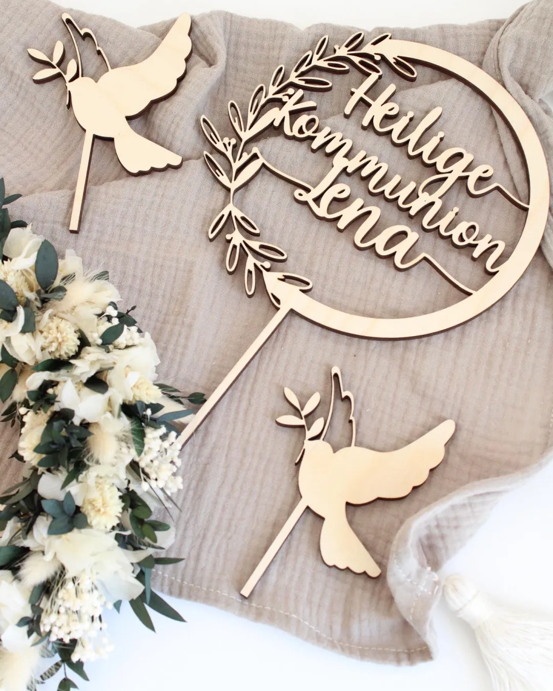 Der Caketopper ist in zwei Größen (15 & 20cm) erhältlich und lässt sich so optimal an die Kuchengröße anpassen. Zusätzlich gibt es eine kleine Holztaube, die den Caketopper perfekt ergänzt oder auch separat bestellt werden kann – ideal für eine harmonische und stimmige Kommunionsdekoration.