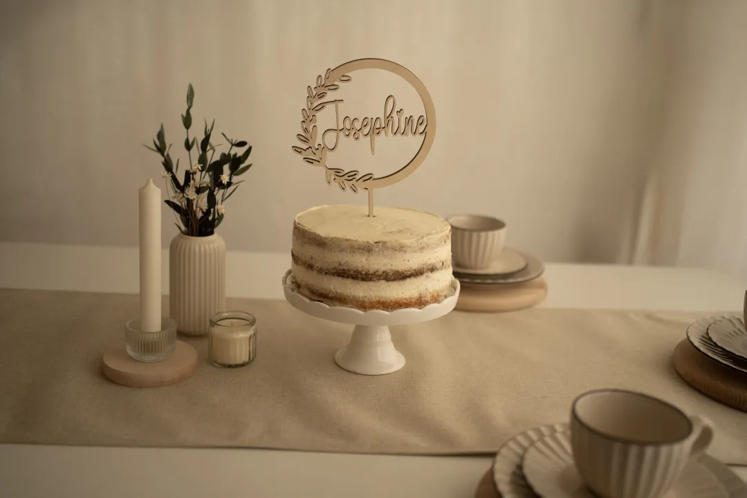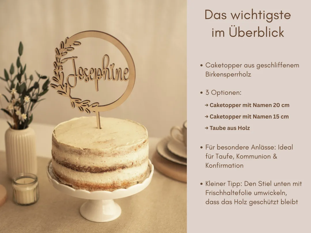 Die Caketopper lassen sich ganz einfach von oben in Kuchen oder Torten einstecken. Damit du lange Freude daran hast, empfehlen wir, die Spitze vor dem Einstecken mit etwas Frischhaltefolie zu umwickeln. So bleibt das Holz geschützt und der Topper kann immer wieder verwendet werden – ein schönes Erinnerungsstück für viele besondere Momente.