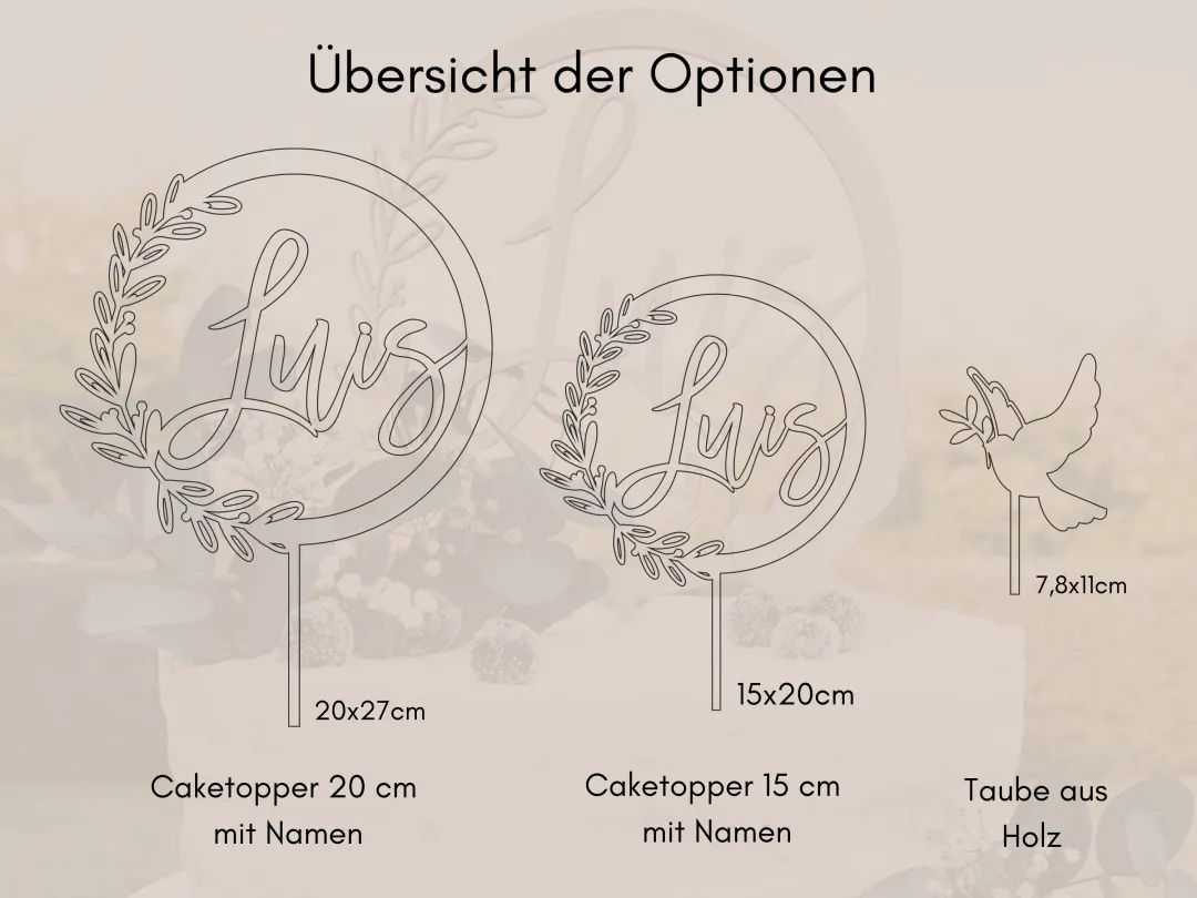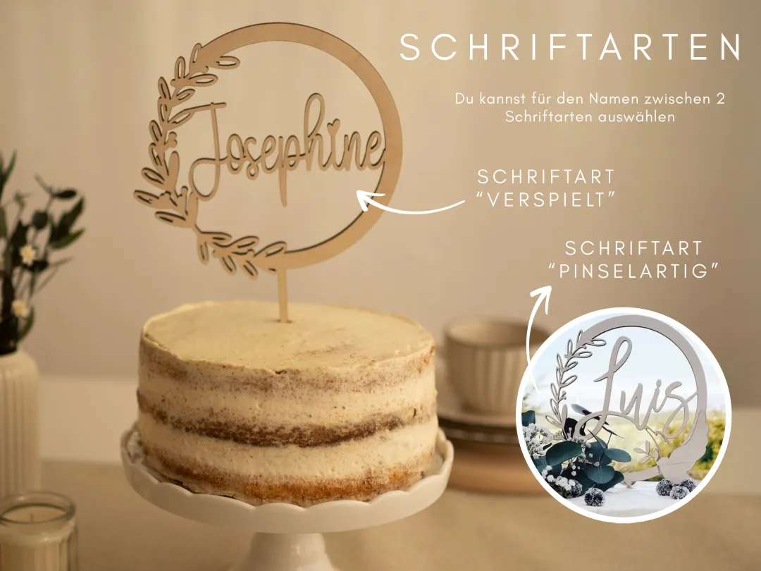 – einem Caketopper im Kranzdesign mit Namen (20 cm oder 15 cm Durchmesser)