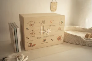 Unsere personalisierte Boho Erinnerungskiste verbindet einen praktischen Stauraum mit einem ruhigen und natürlichen Design. Sie bietet Platz für viele kleine Dinge, die im Alltag eines Kindes wichtig werden und später zu wertvollen Erinnerungen wachsen.