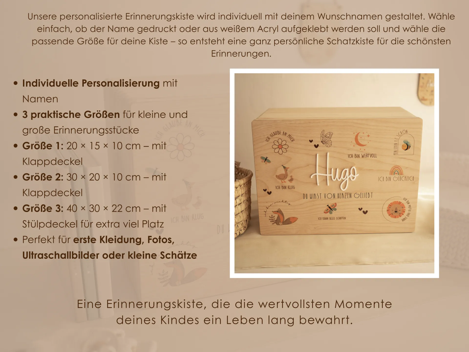 Unsere personalisierte Boho Erinnerungskiste verbindet einen praktischen Stauraum mit einem ruhigen und natürlichen Design. Sie bietet Platz für viele kleine Dinge, die im Alltag eines Kindes wichtig werden und später zu wertvollen Erinnerungen wachsen.