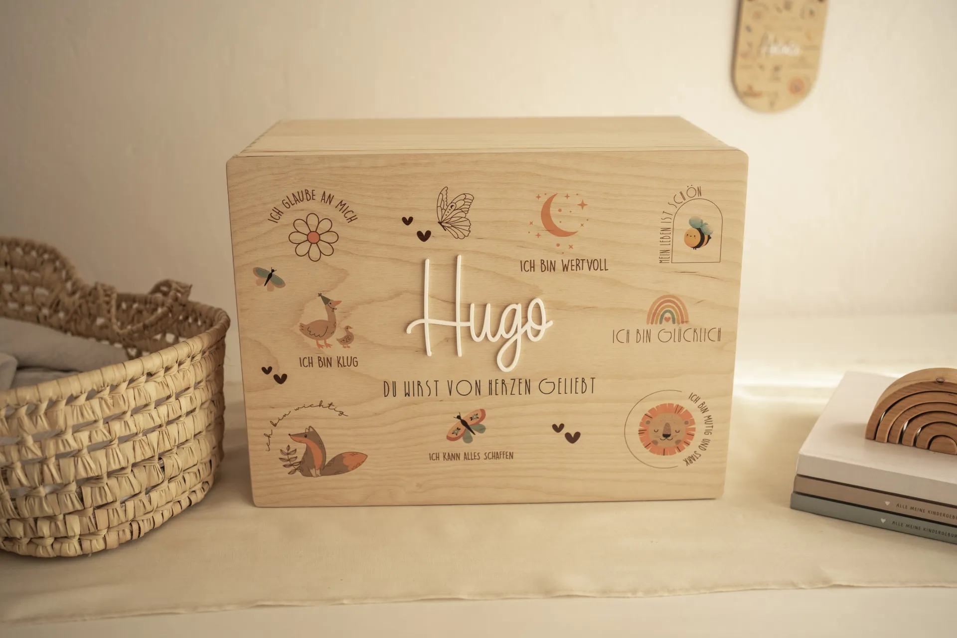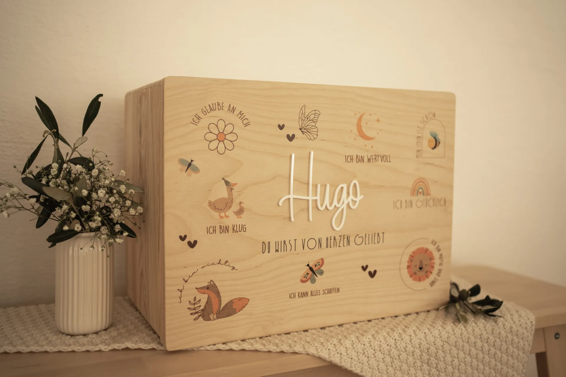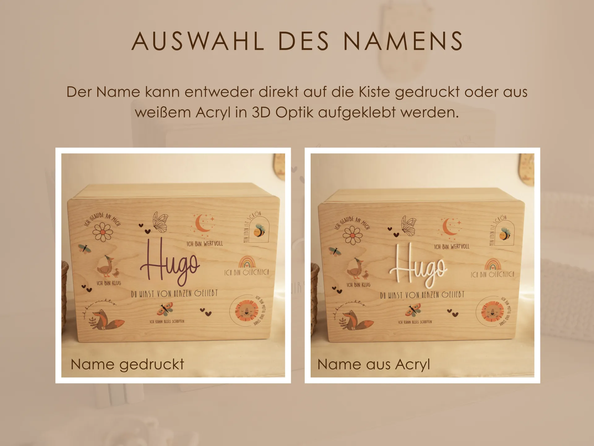 Der Name deines Kindes macht diese Holzkiste mit Namen zu einem ganz persönlichen Erinnerungsstück. Du kannst wählen zwischen einem 3D Acryl Namen oder einem gedruckten Namen, der direkt auf die Oberfläche aufgebracht wird.