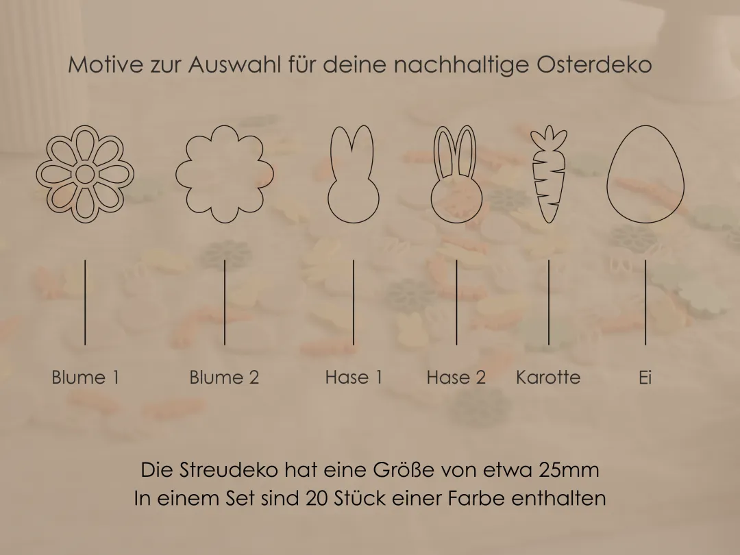 Diese Streudeko ist nicht nur hübsch, sondern auch vielseitig. Ob auf der gedeckten Kuchentafel, als Highlight in einem Osternest oder als besondere Verzierung für die Ostergeschenke – die kleinen Ostermotive finden fast überall Anwendung! Auch für DIY-Projekte wie dekorative Windlichter oder selbstgemachte Osterkränze sind sie ideal. Nach Ostern kannst du die Plättchen einfach aufbewahren und immer wieder verwenden, wodurch sie eine nachhaltige Alternative zu Einweg-Konfetti sind.