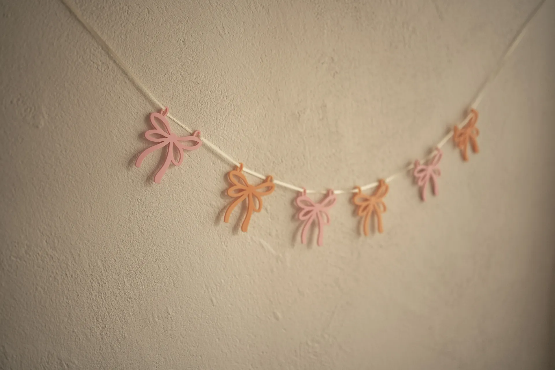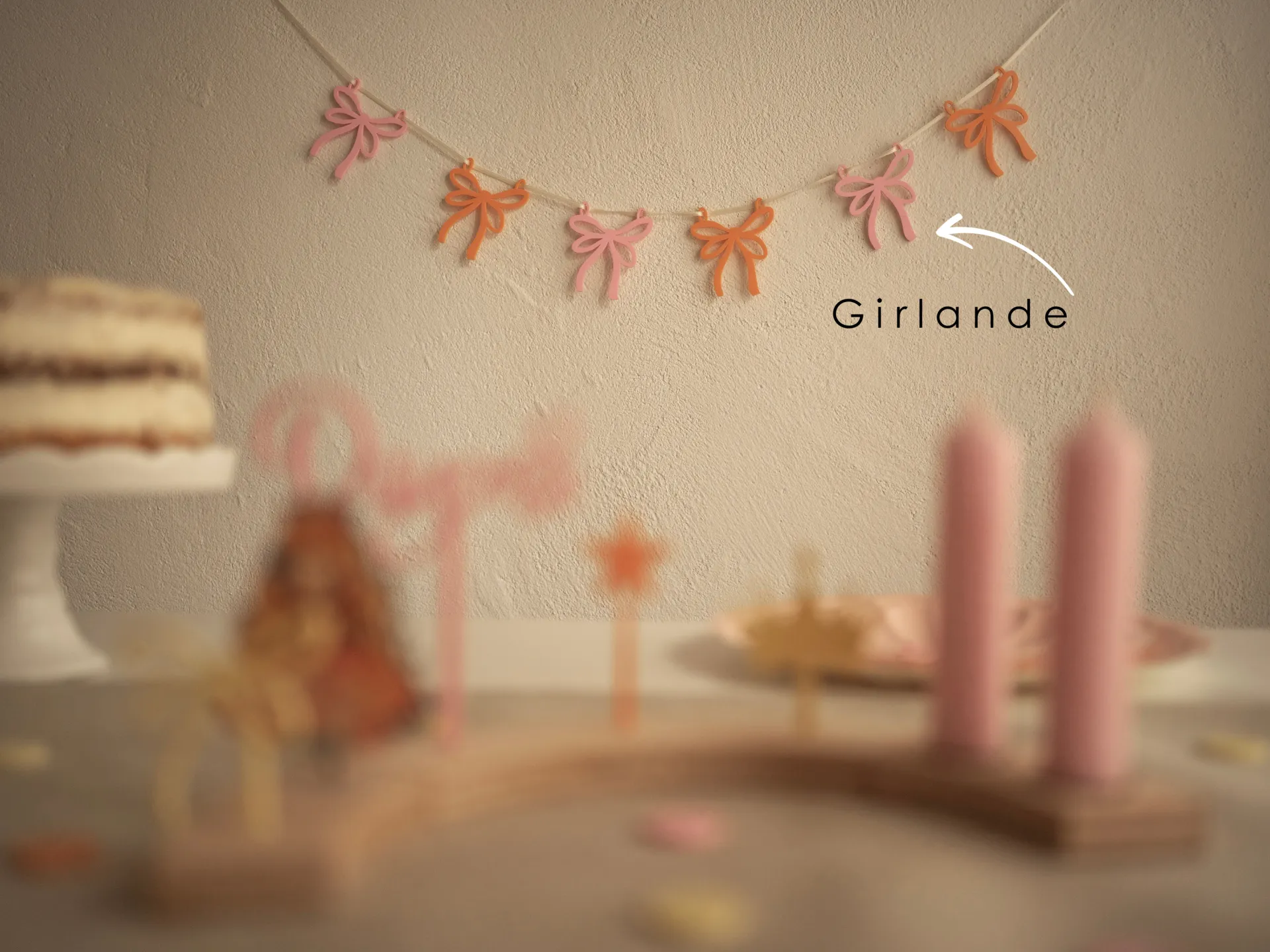 Die dazu passende Prinzessinnen Girlande aus Acryl besteht aus sechs Schleifen in zwei Farben und wird mit einer Kordel geliefert – perfekt zum Aufhängen über dem Geschenketisch oder im Kinderzimmer.