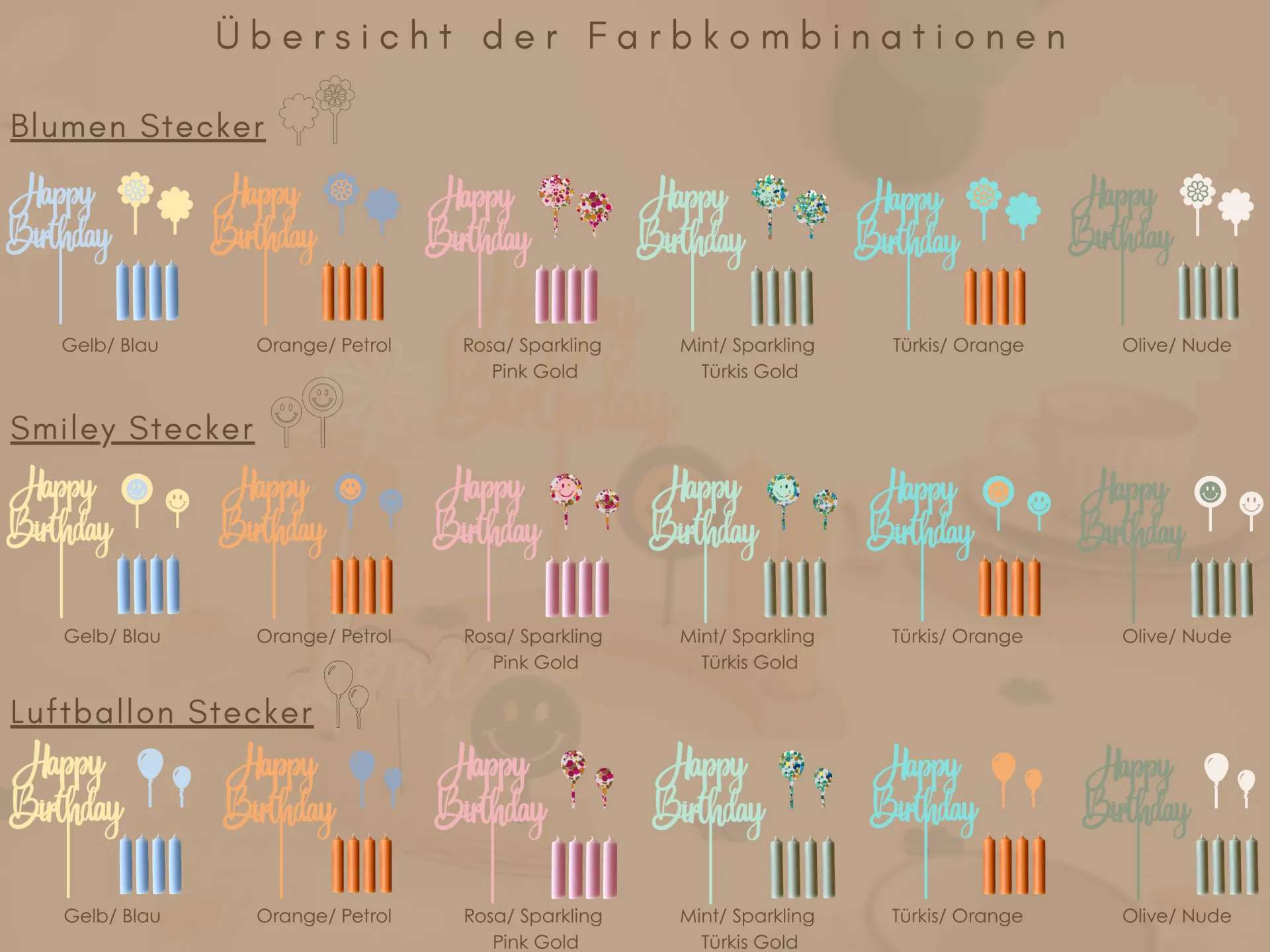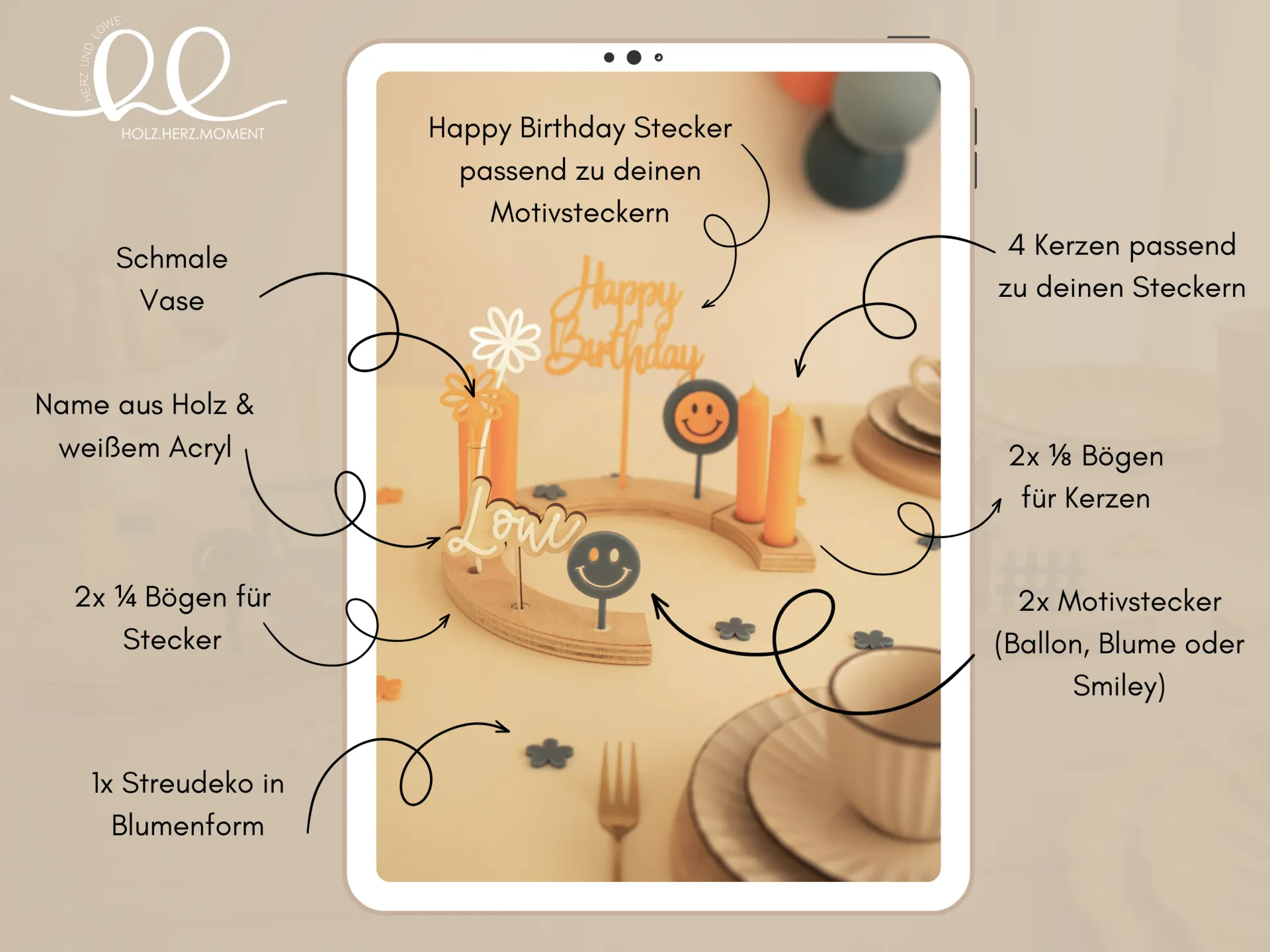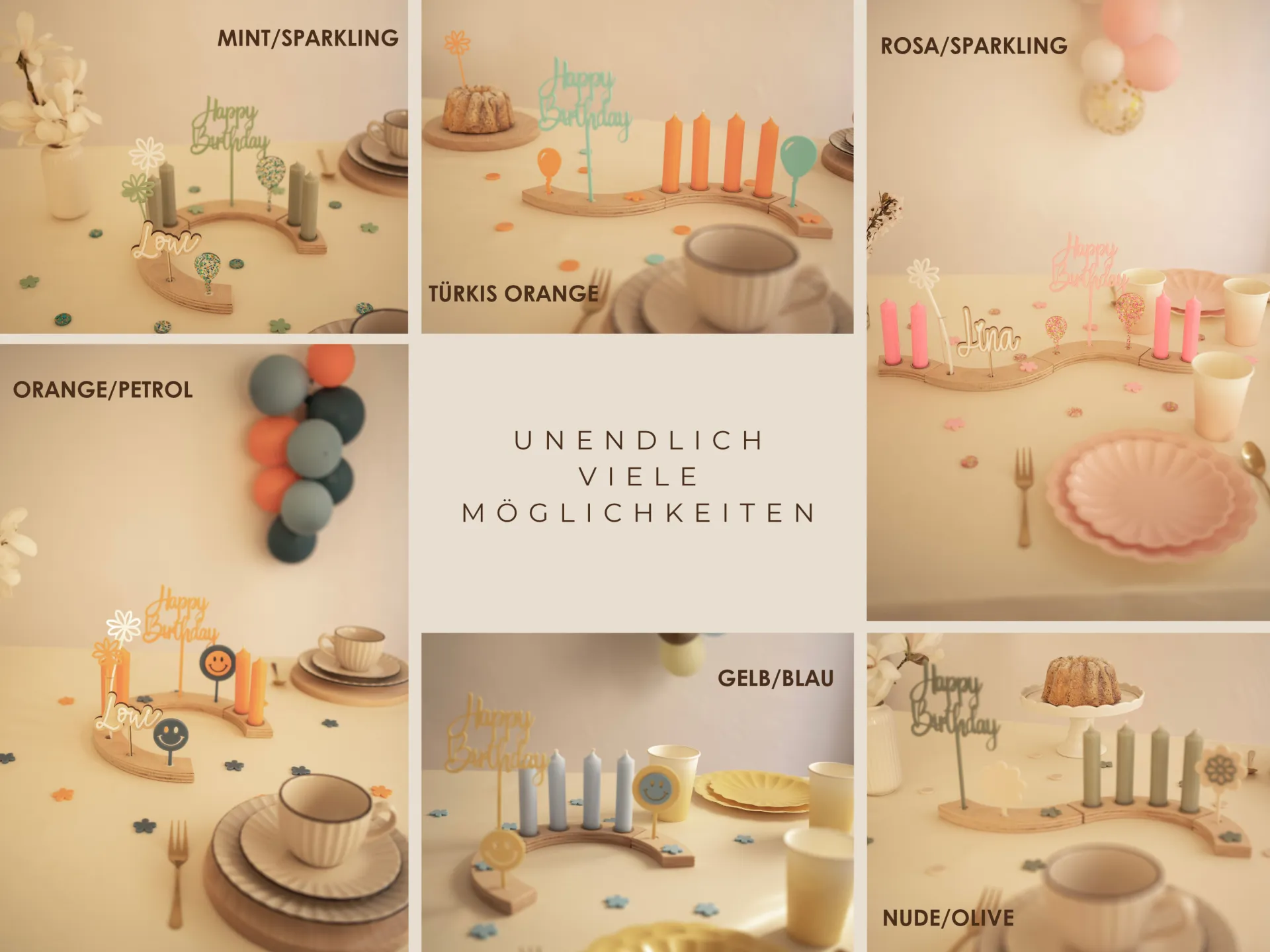 Alle Elemente sind individuell kombinierbar und können mit weiteren Bögen, Steckern und vielem mehr ergänzt werden – so wächst euer Geburtstagsritual mit den Jahren. Die Farbwahl passt du ganz nach Wunsch an – eine Übersicht findest du in den Produktfotos.