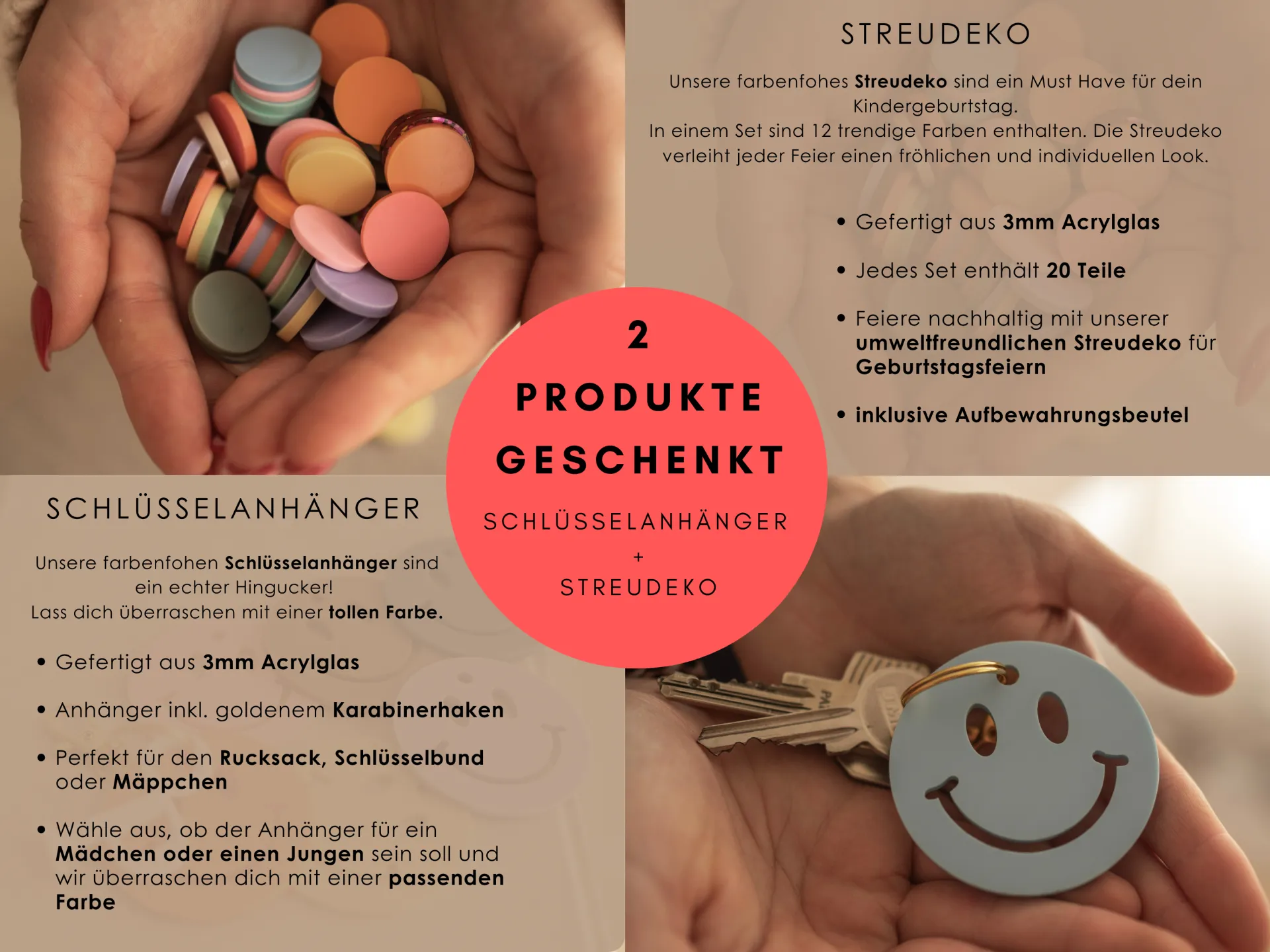 Dieses Set enthält alles, was du brauchst, um eine schöne Atmosphäre zu schaffen. Kerzentüllen, handangepasste Kerzen, Acrylmotive wie Smiley, Ballon oder Blume, Streudeko und ein „Happy Birthday“-Stecker sind nur einige der liebevollen Bestandteile.