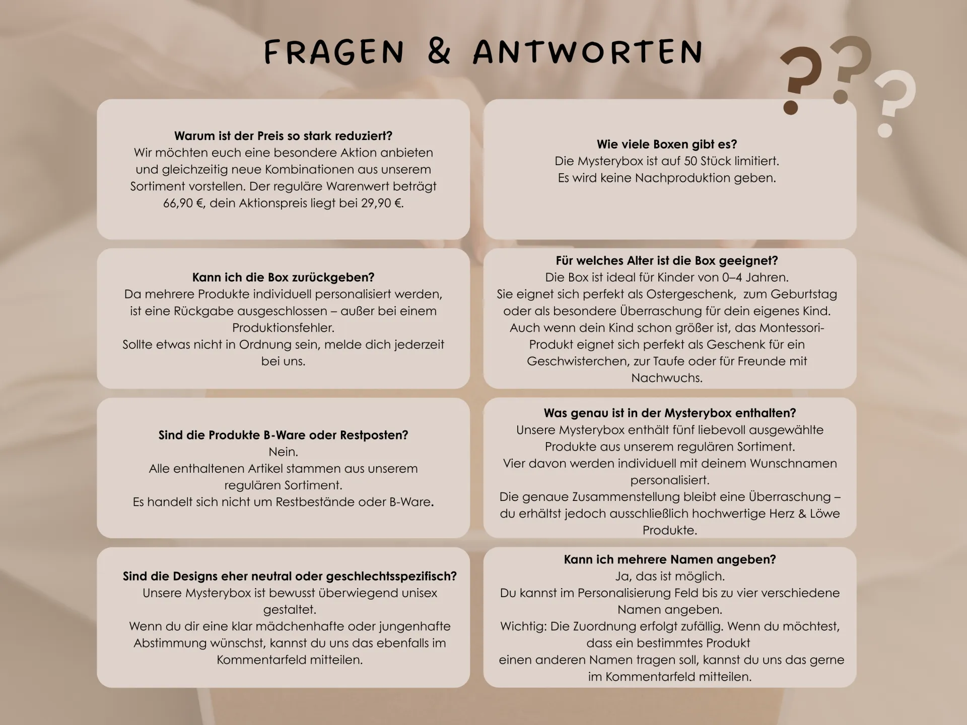 Da mehrere Produkte individuell angefertigt werden, ist die Mysterybox vom Umtausch ausgeschlossen (außer bei Produktionsfehlern).