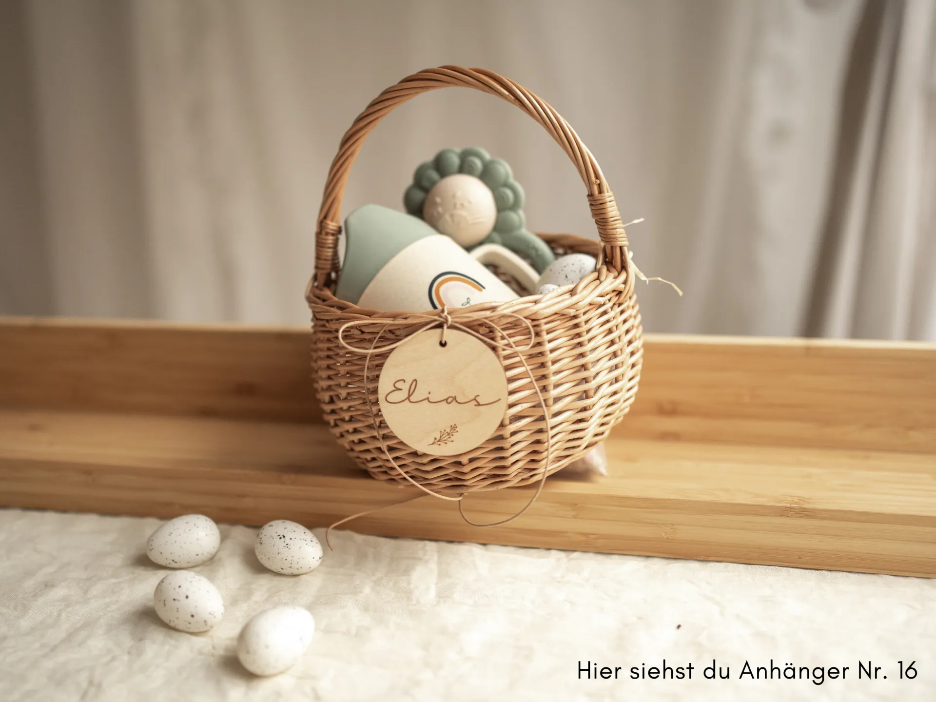 Mit unserem liebevoll gestalteten, personalisierten Osterkörbchen mit Anhänger schenkst du nicht nur ein wunderschönes Ostergeschenk, sondern erfüllst den Ostermorgen mit strahlenden Kinderaugen. Jedes Körbchen wird zum einzigartigen Highlight – perfekt gefüllt mit kleinen Überraschungen und liebevollen Geschenken.