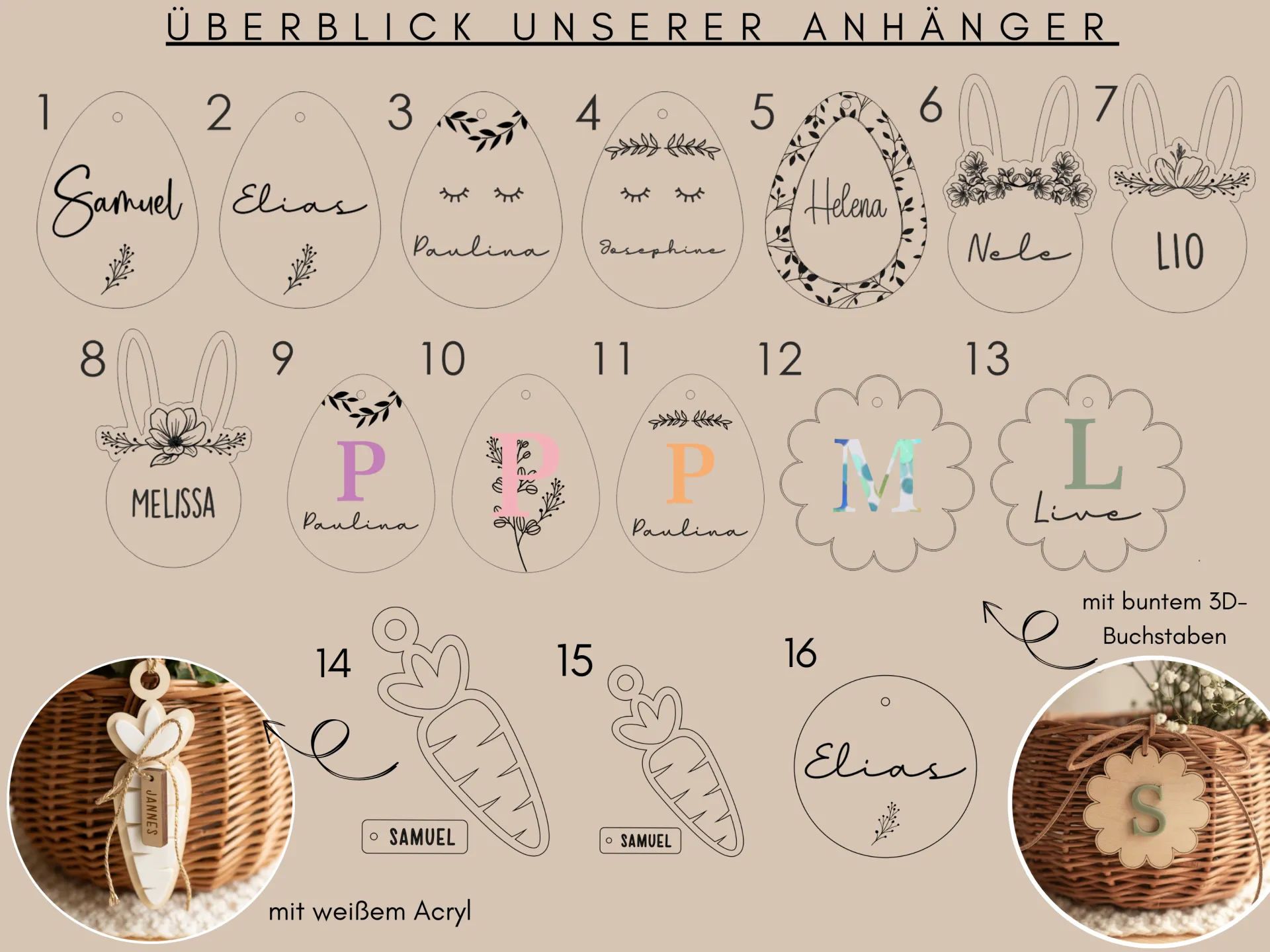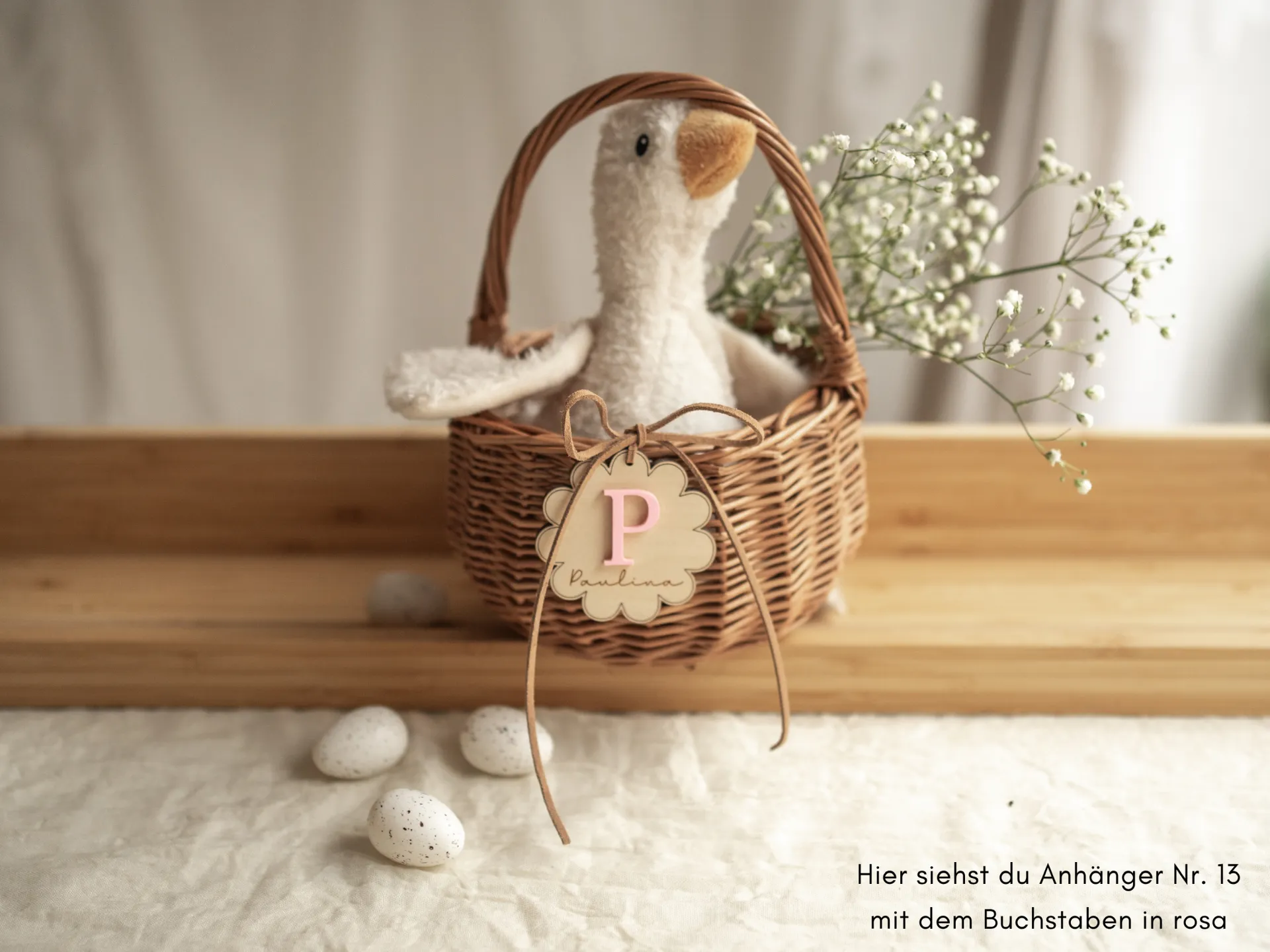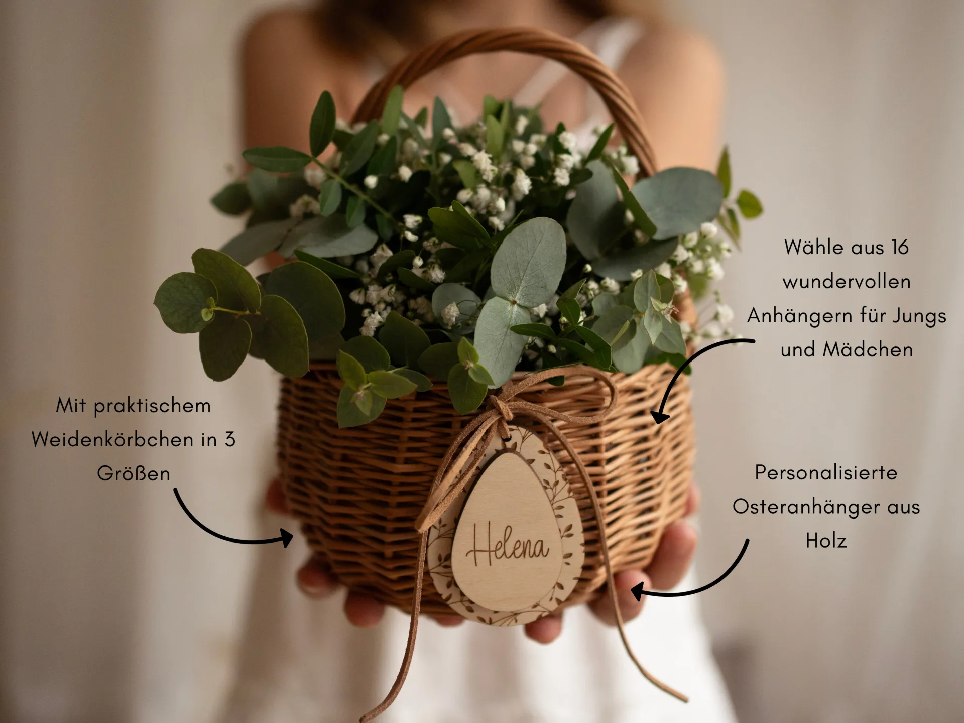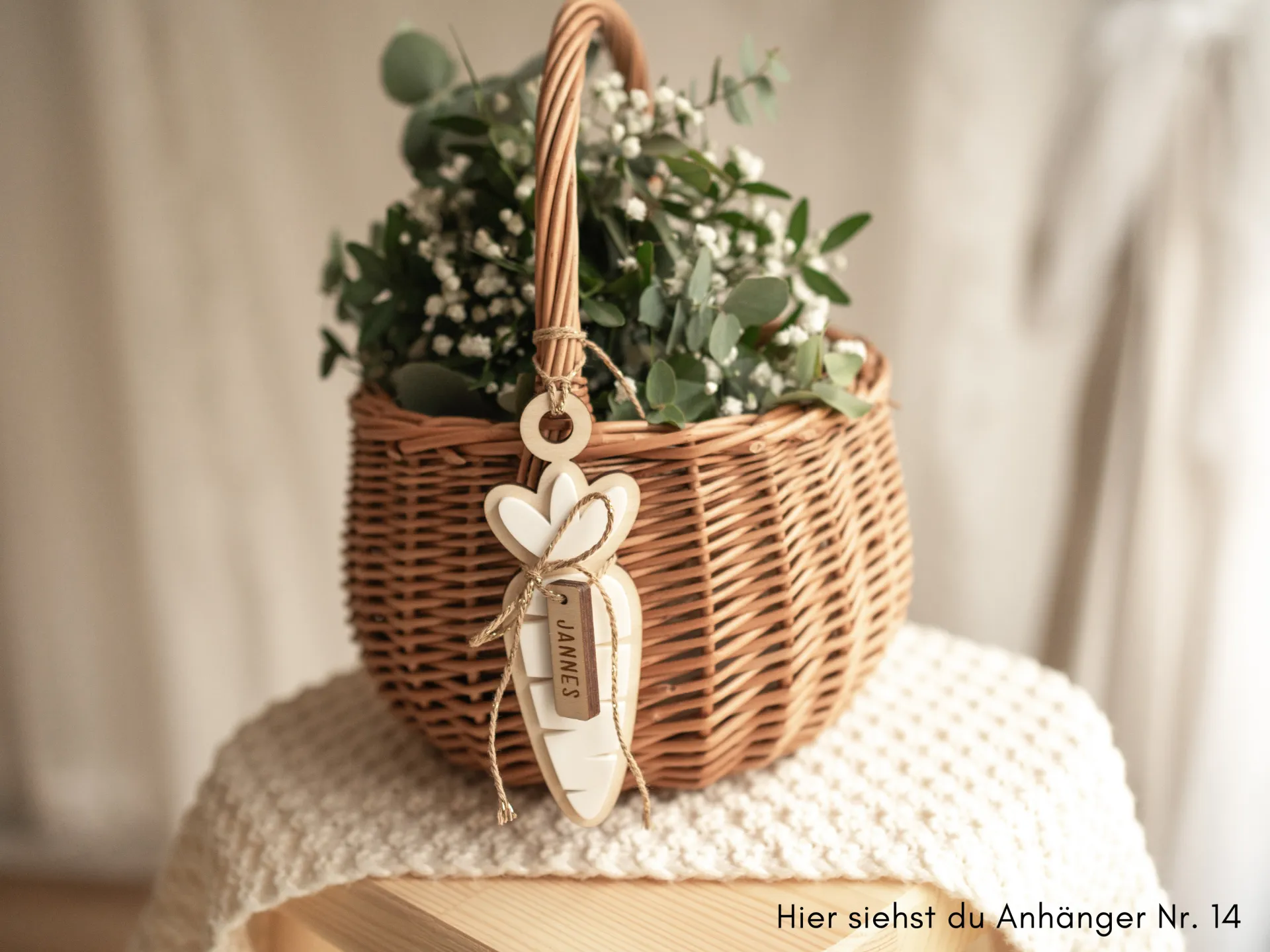 Das Körbchen besteht aus robuster Weide, die Anhänger aus 5 mm starkem Birkensperrholz.