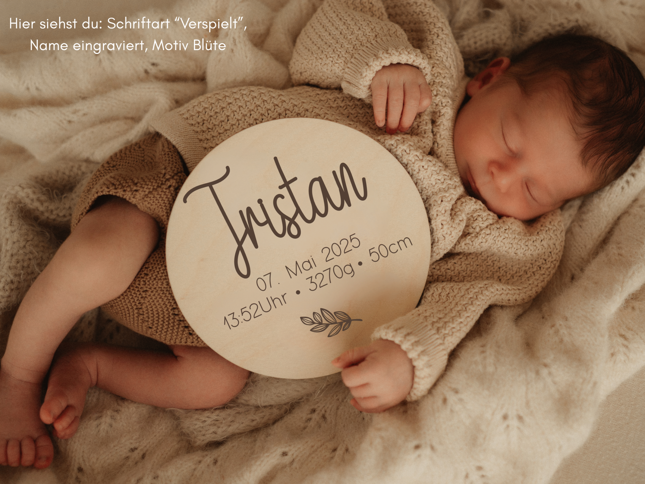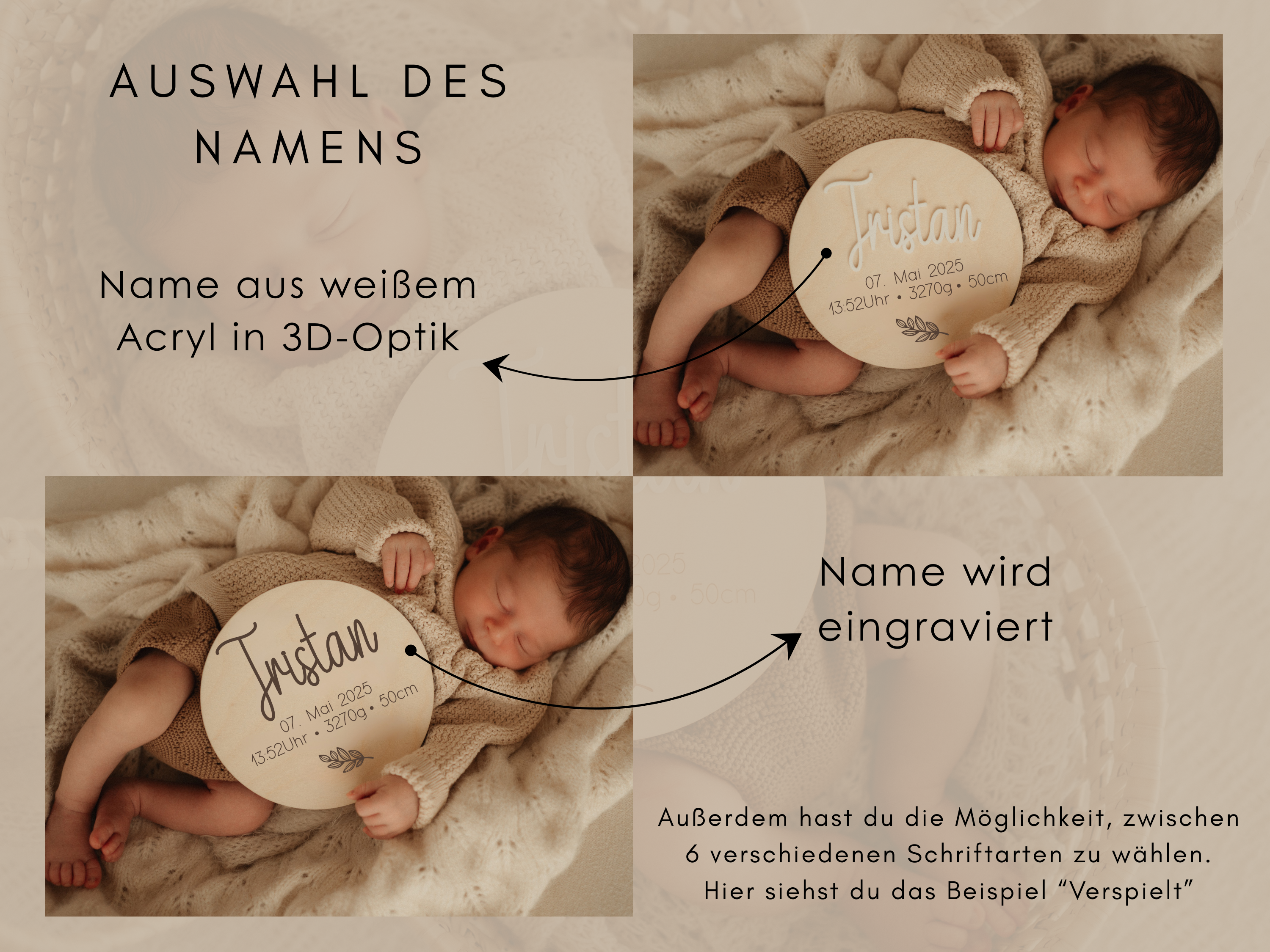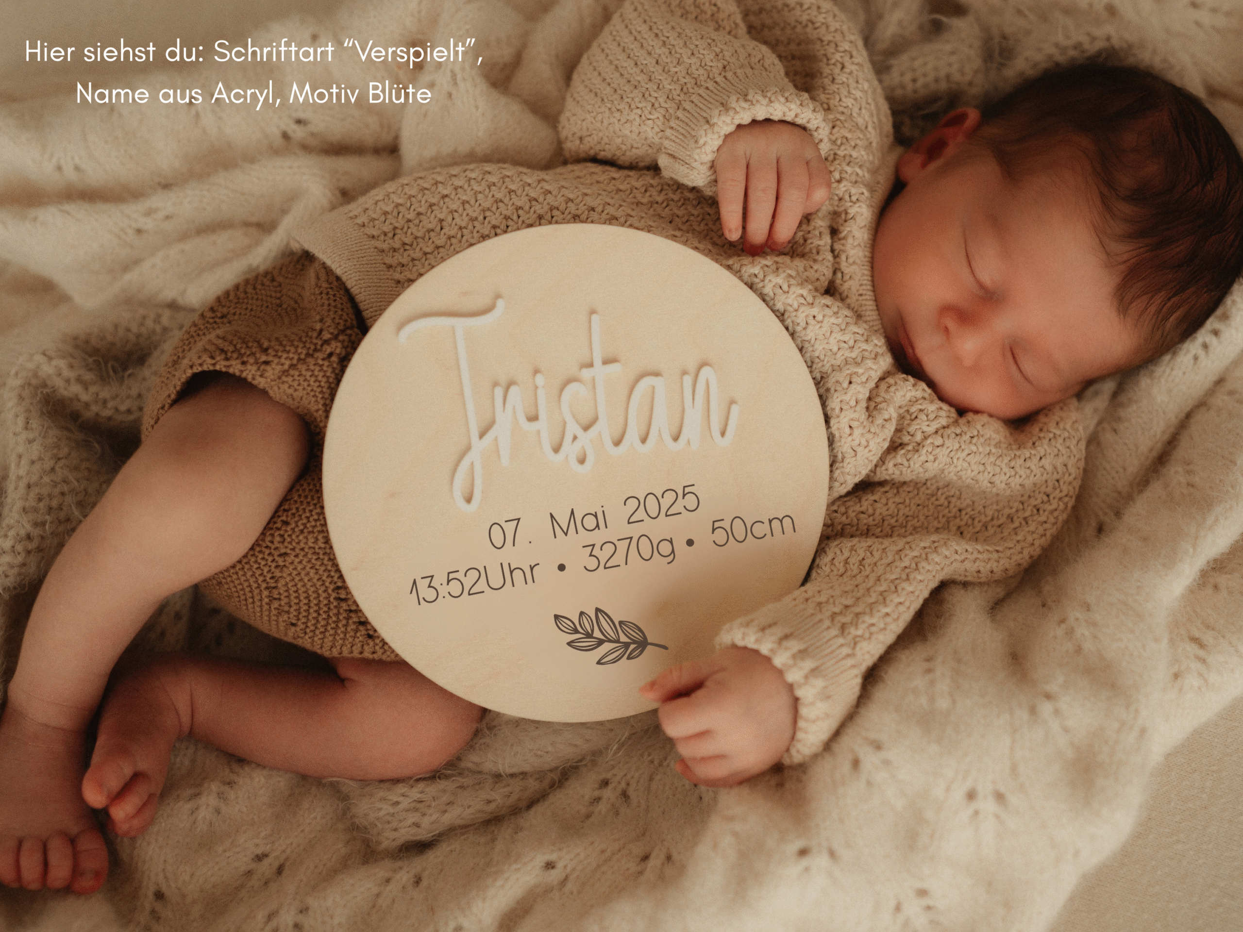Wähle entweder eine gravierte Variante mit dem Namen deines Kindes oder entscheide dich für einen dreidimensionalen, edlen Schriftzug aus weißem Acrylglas (Dicke 3mm). Verschönere deine persönliche Geburtsscheibe zusätzlich mit einem süßen Motiv und wähle aus unserer großen Auswahl an verschiedenen Schriftarten - so findest du genau das Design, das perfekt zu dir und deinem kleinen Liebling passt.