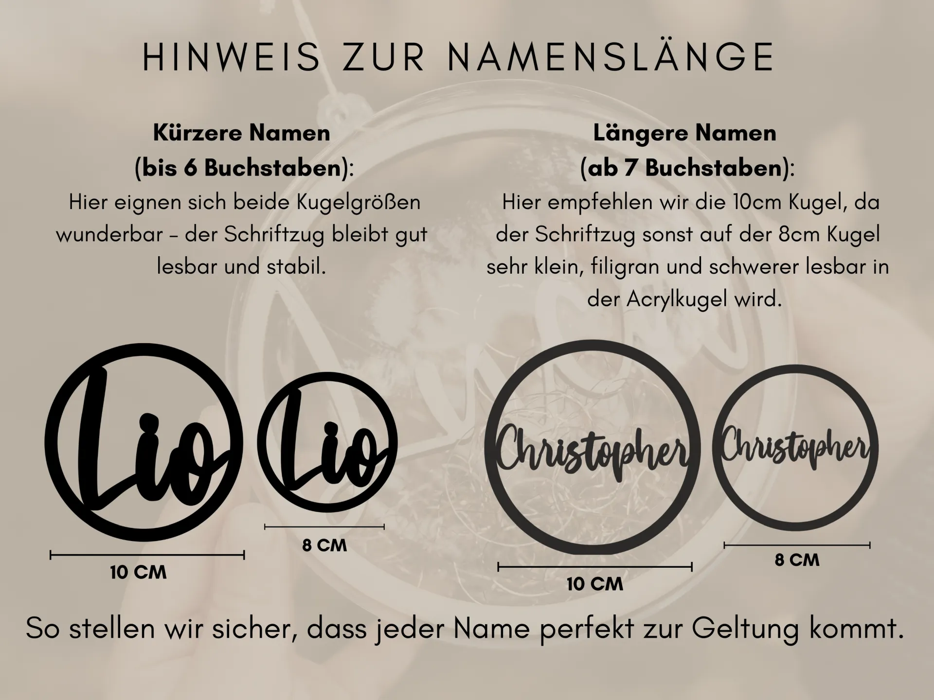 Das besondere Highlight: In der Mitte der Kugel befindet sich ein integrierter Anhänger aus 5 mm starkem Birkensperrholz, der mit deinem Wunschnamen personalisiert wird. Durch den 3D-Effekt schwebt der Name dekorativ im Inneren – ein echter Hingucker am Weihnachtsbaum.