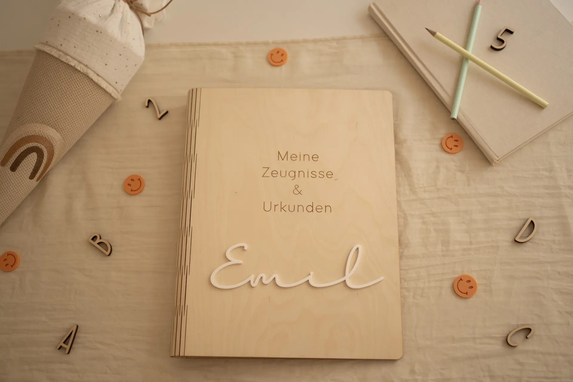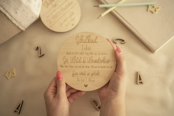 Diese Geschenkidee zur Einschulung verbindet Funktionalität mit emotionalem Wert. Perfekt als Geschenk für Schulkinder, das nicht nur praktisch ist, sondern auch stolz macht. Wenn du es farbenfroher magst, findest du bei uns auch Varianten als Zeugnismappe aus Holz mit buntem Druck oder als Leinenmappe mit farbigem Design – für jeden Geschmack das passende Lieblingsstück.