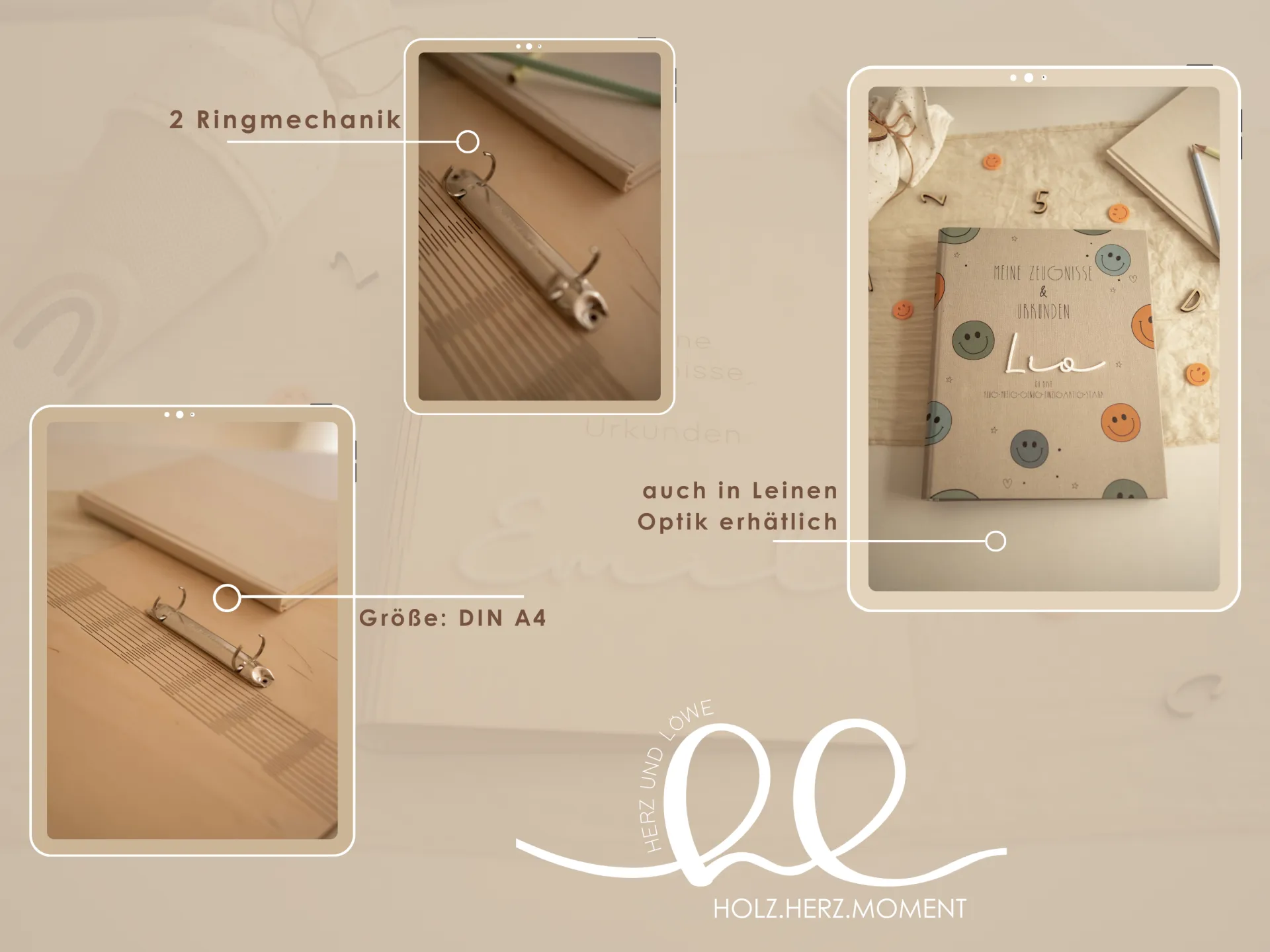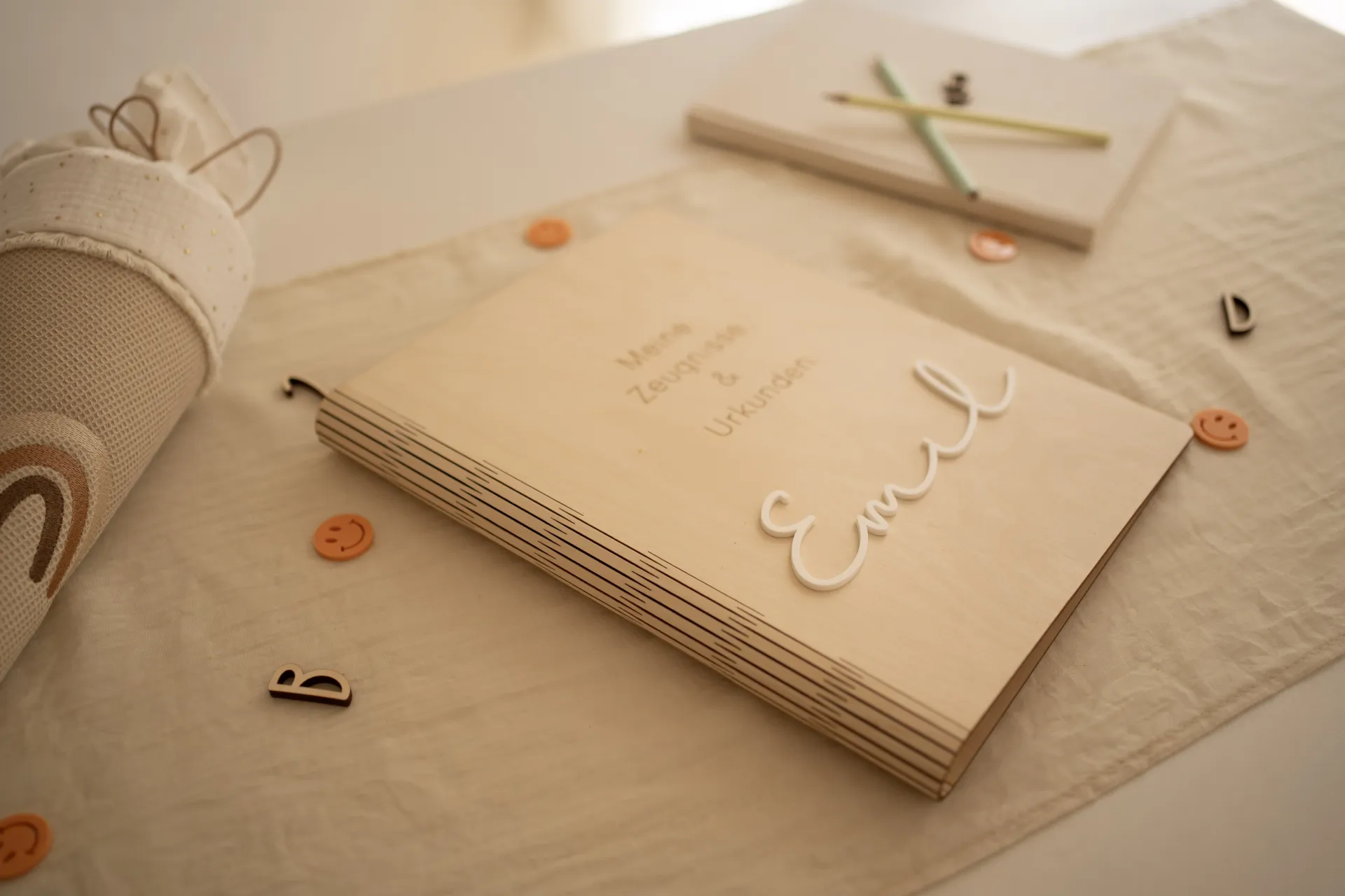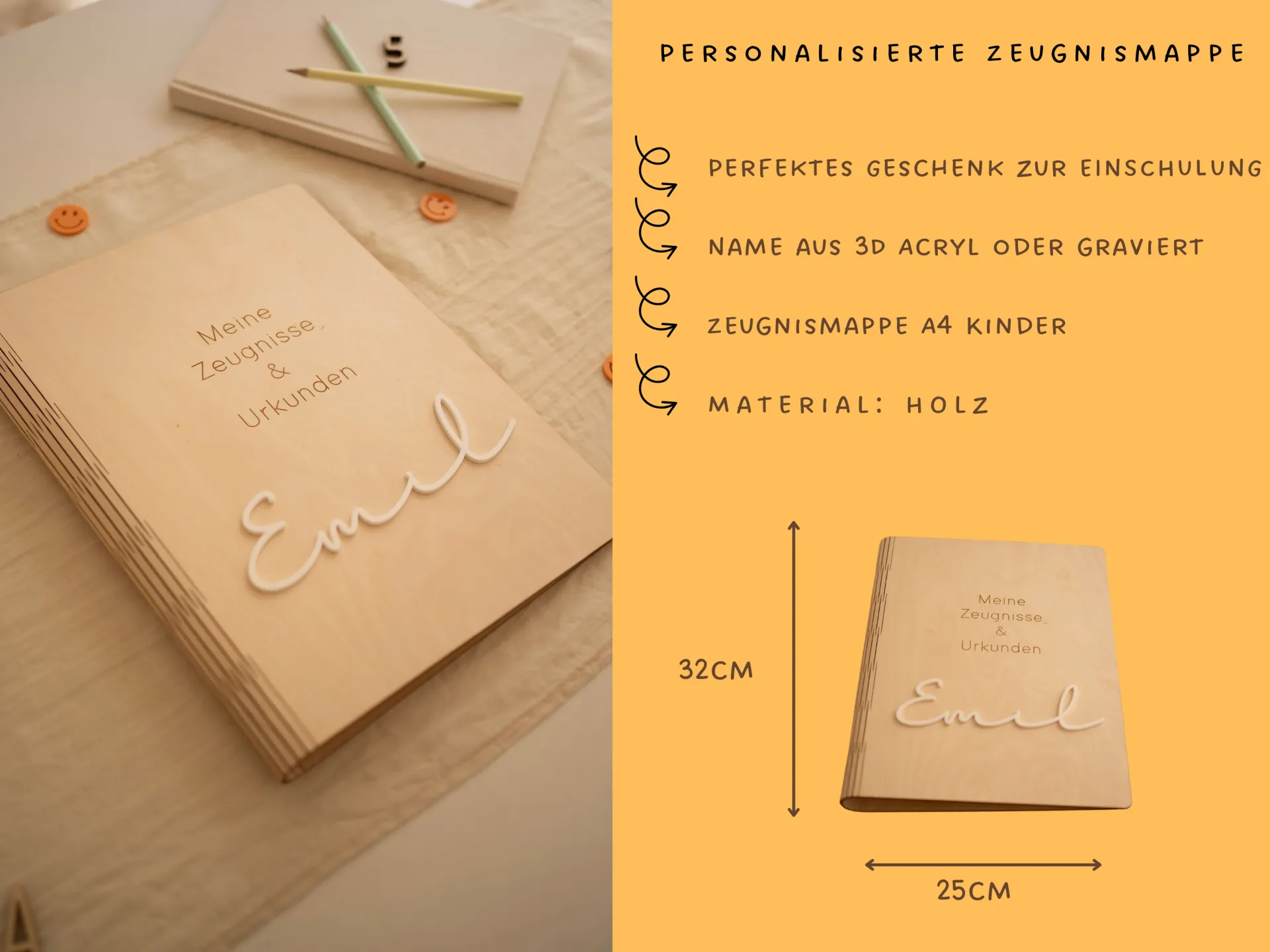 Mit einem Format von ca. 32 x 25 cm ist der A4 Ordner ideal für alle wichtigen Unterlagen wie Zeugnisse, Urkunden und Bescheinigungen. Der stabile Zeugnisordner aus Holz schützt die Dokumente zuverlässig und sorgt dafür, dass nichts verloren geht. Gleichzeitig ist er robust genug, um dein Kind viele Jahre zu begleiten.