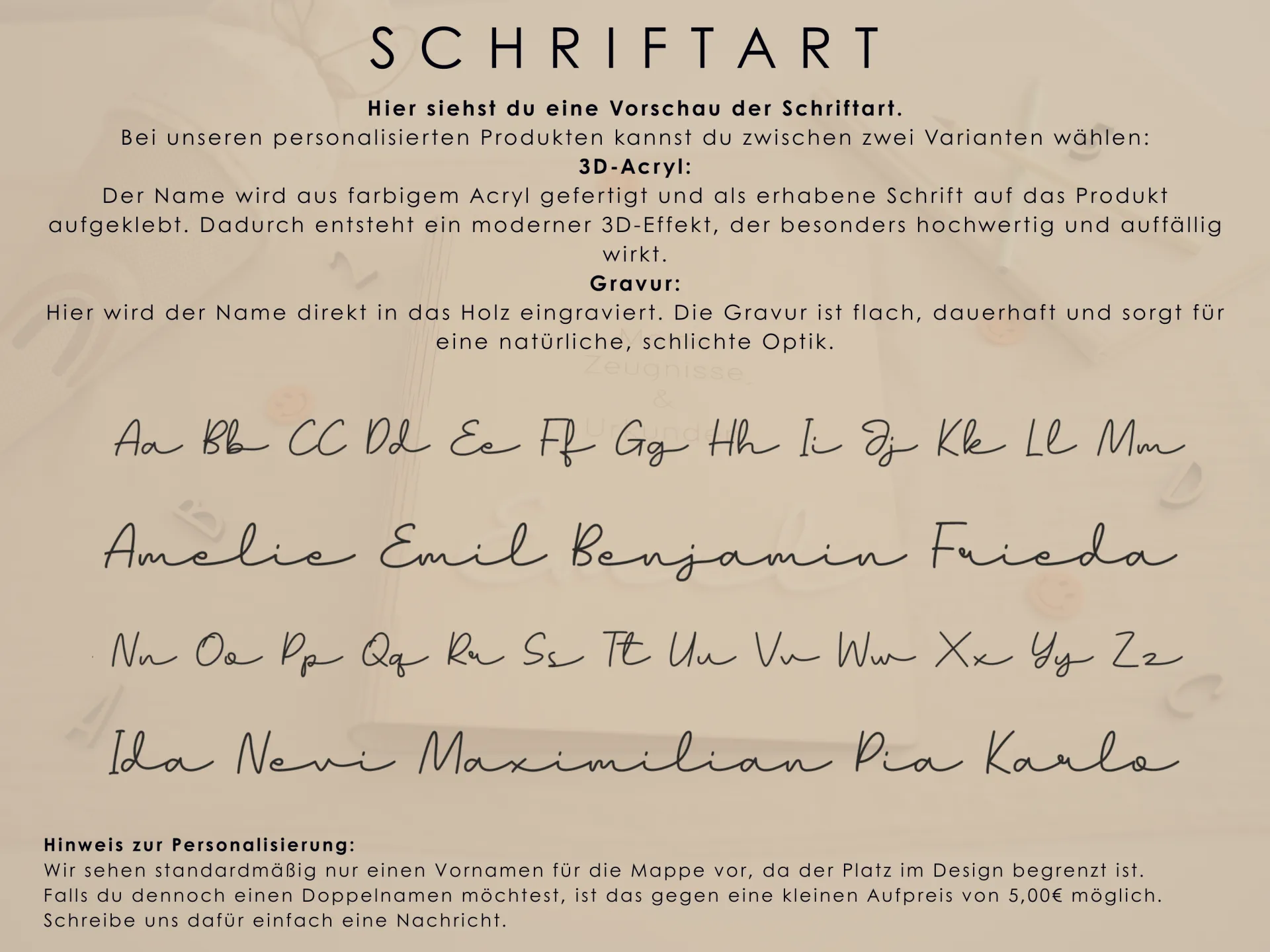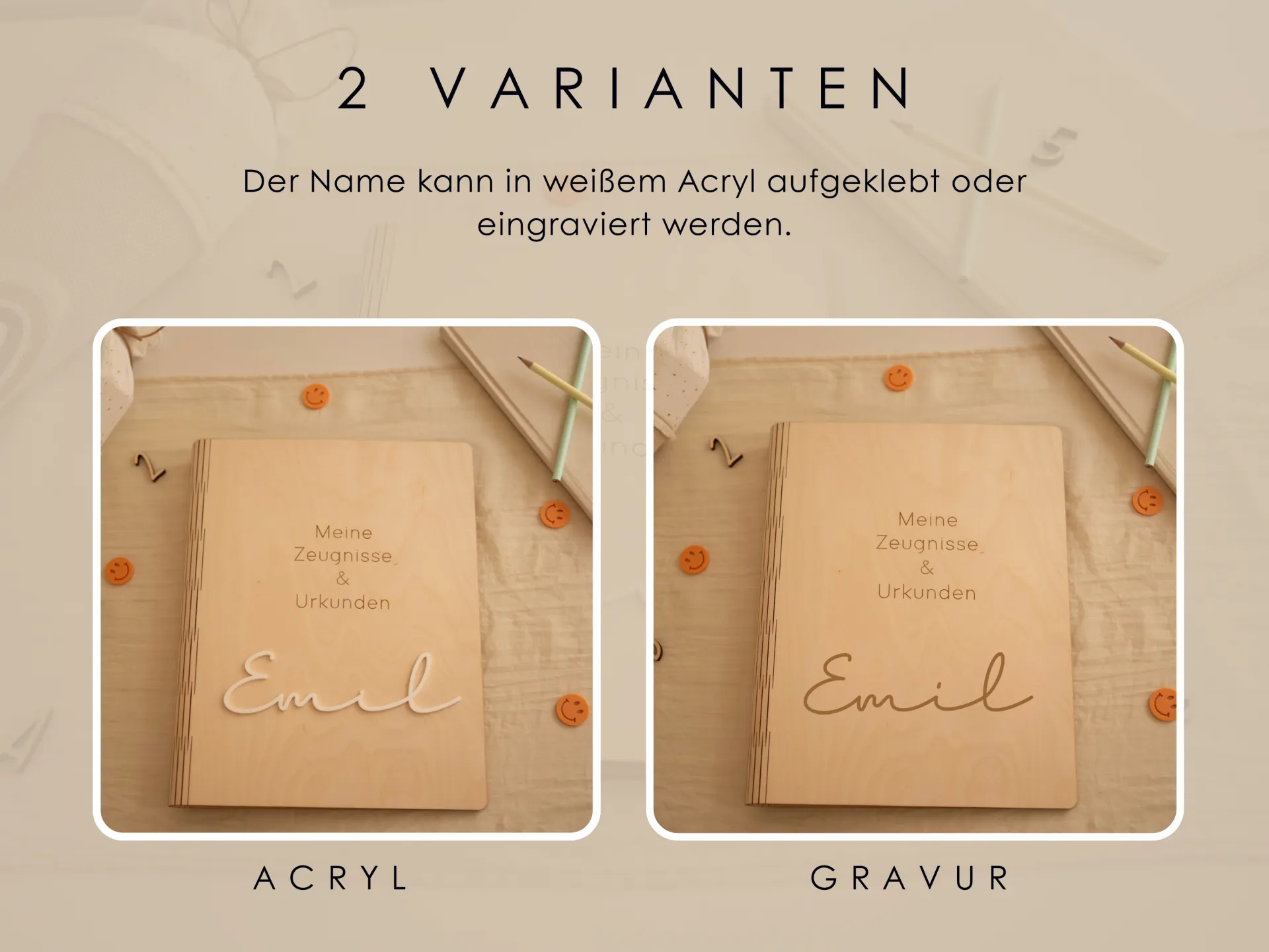 Unter der Gravur wird der Name deines Kindes entweder als edler 3D-Acrylschriftzug oder klassisch eingraviert umgesetzt. Dadurch entsteht eine moderne, hochwertige Optik, die sofort ins Auge fällt. Unsere Zeugnismappe personalisiert passt perfekt zu jedem Stil – schlicht, zeitlos und mit ganz viel Bedeutung.