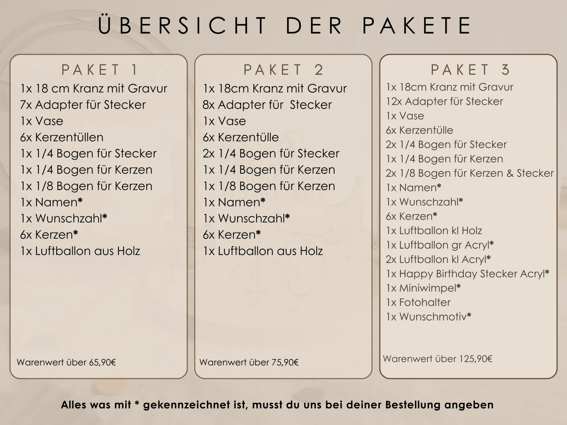 Du kannst zwischen 3 Paketgrößen wählen – je nach Wunsch und Dekobedarf.
