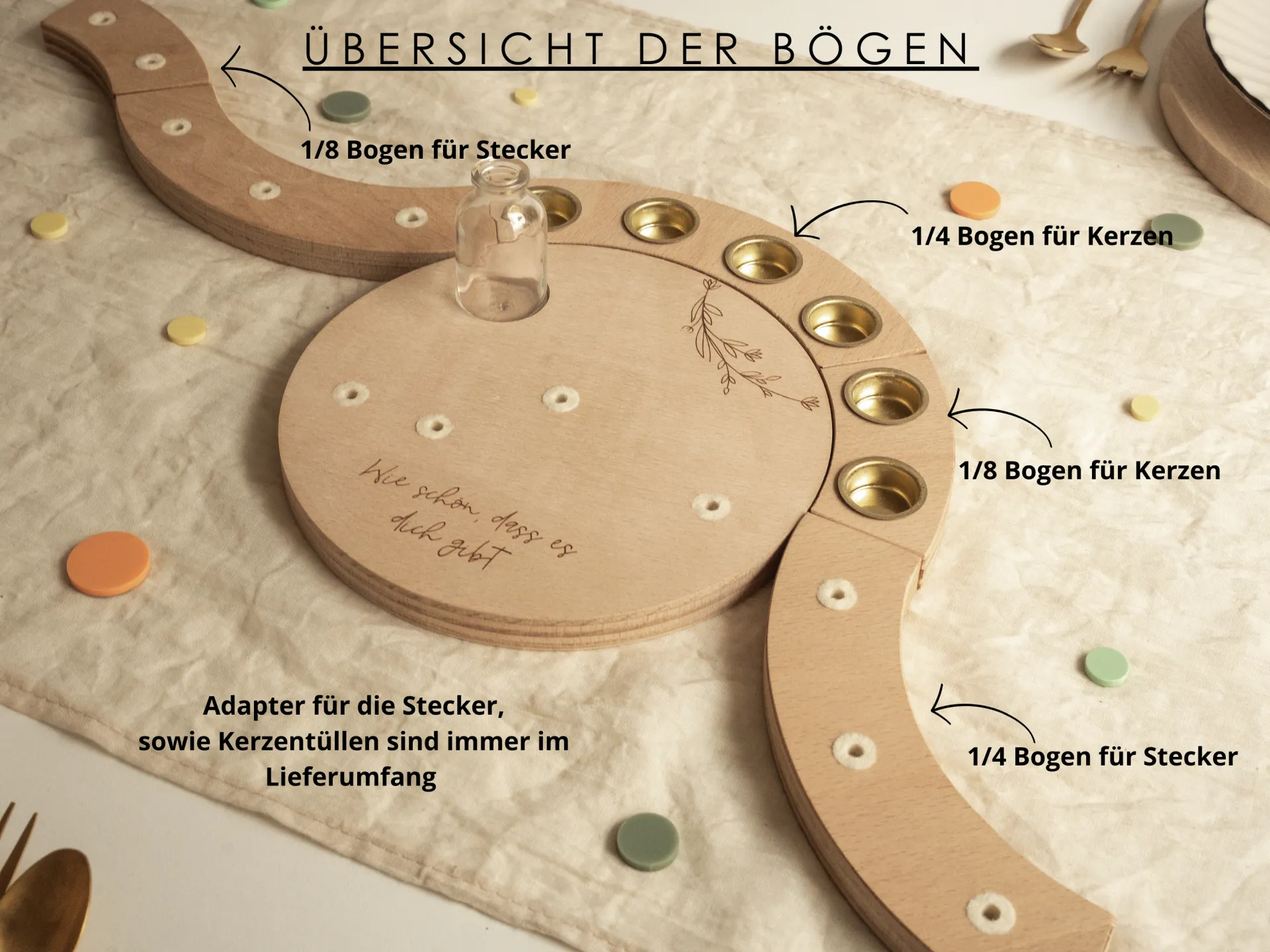 • Teller & Holzbögen: hochwertiges Buchenholz