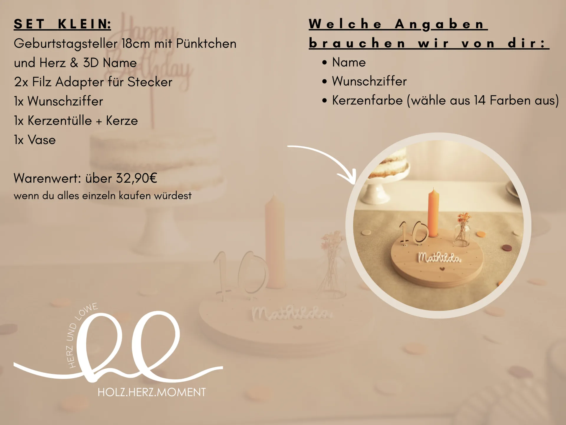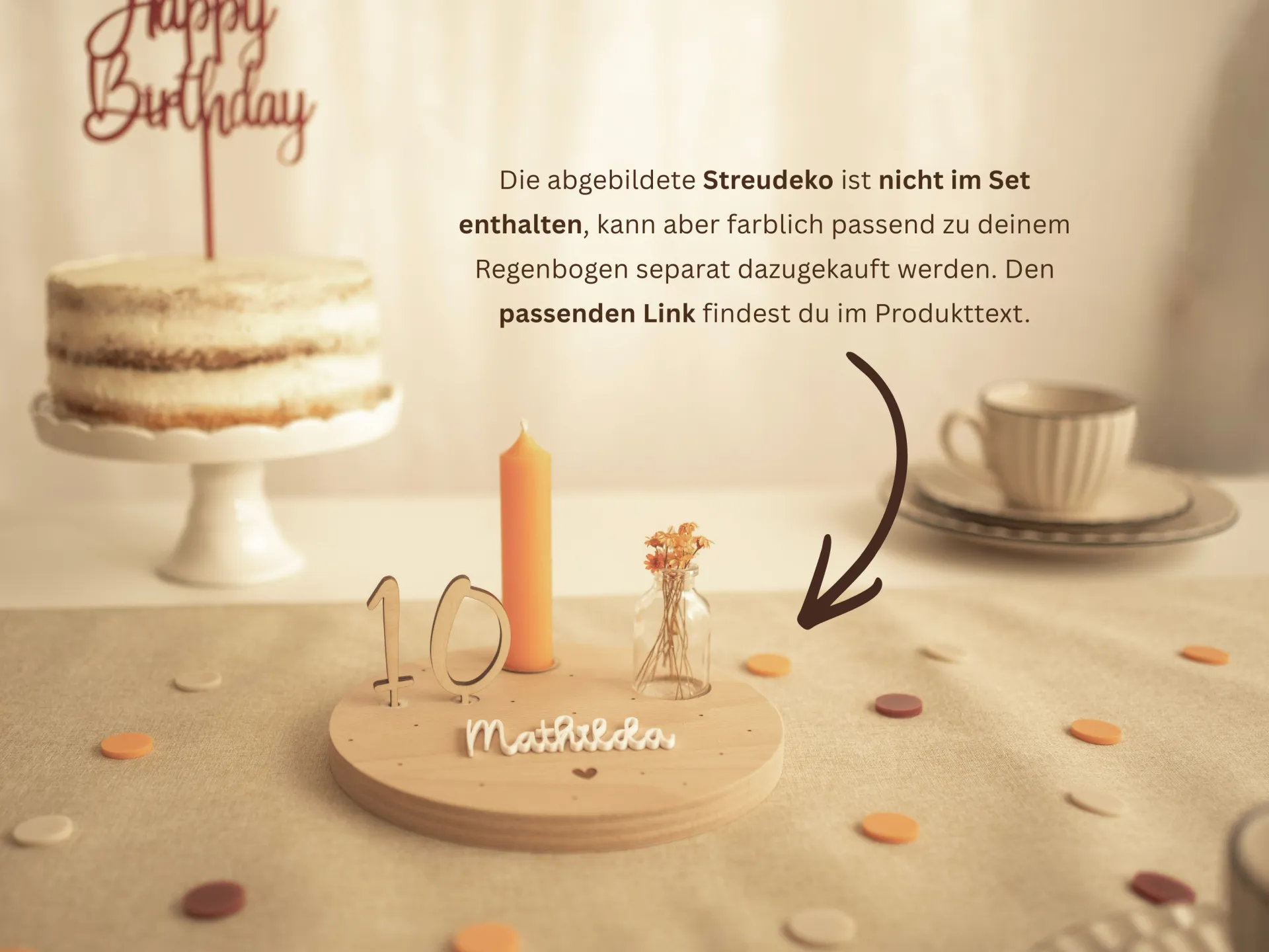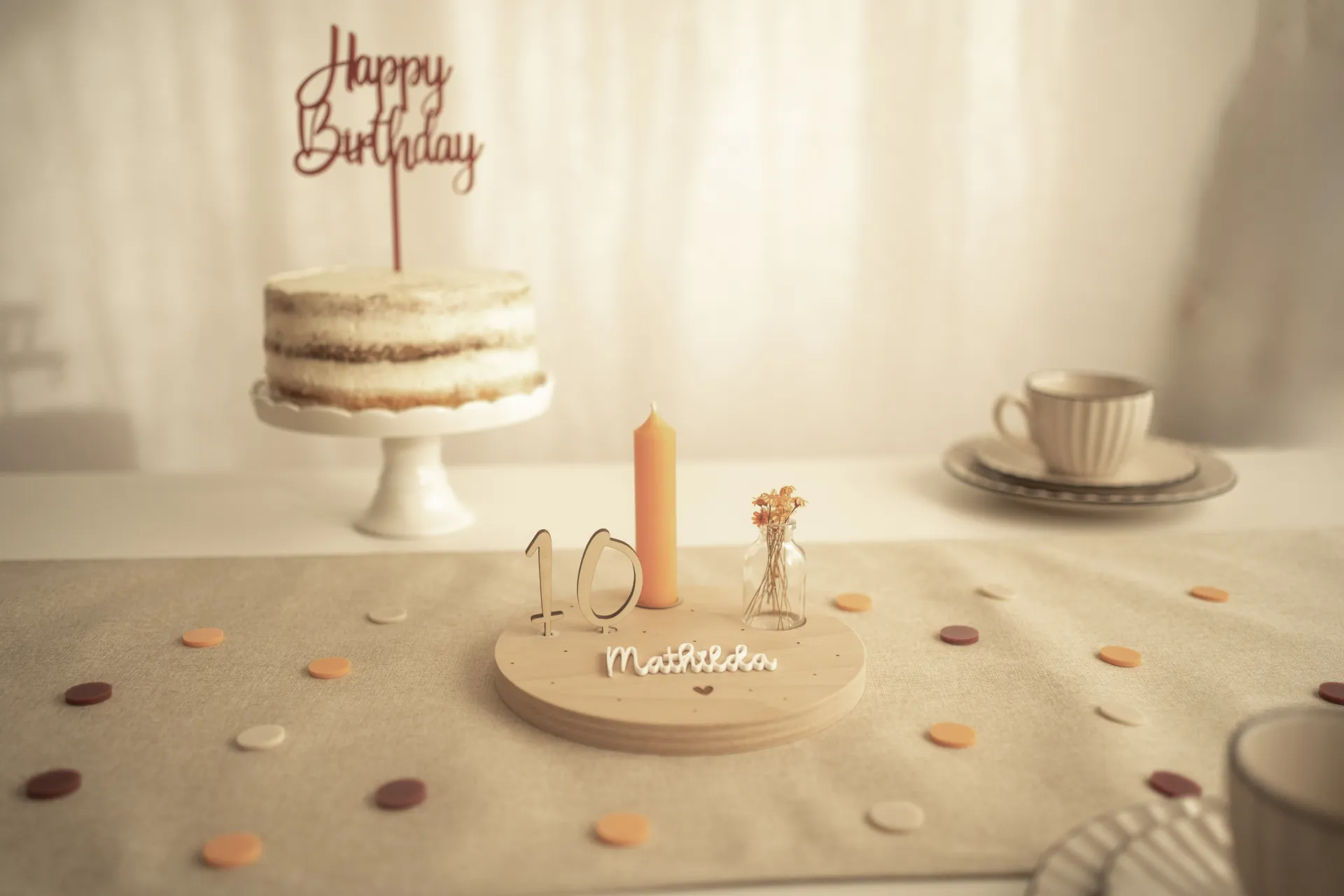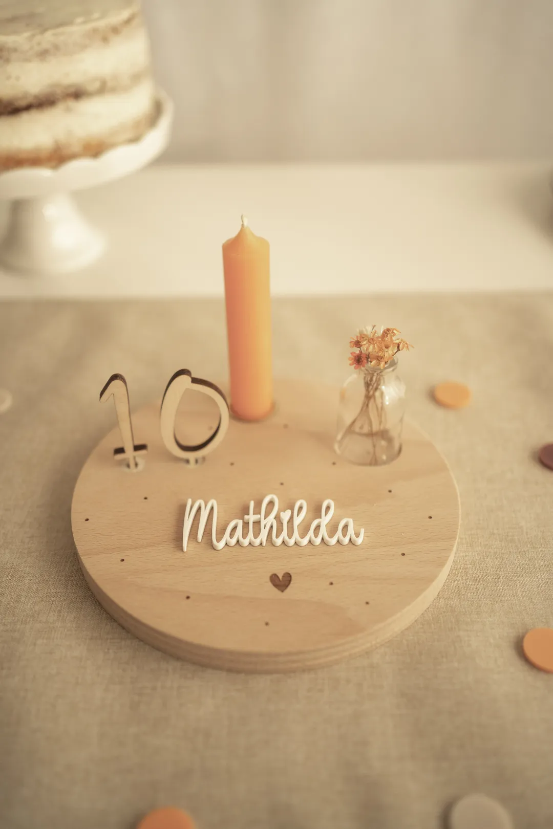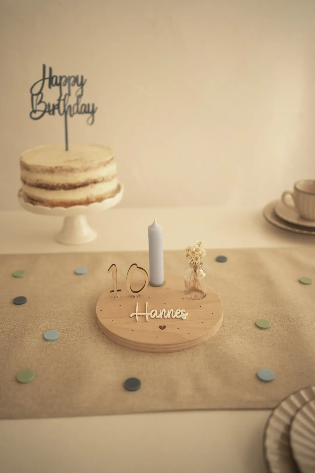 Der runde Geburtstagsteller aus Holz ist liebevoll mit zarten Pünktchen, einem gravierten Herz und deinem Wunschnamen in 3D-Acryl gestaltet. Zwei Adapter ermöglichen das Einsetzen deiner gewünschten Jahreszahl – so begleitet dich der Kranz ein Leben lang. Eine hochwertige Kerze und eine Mini-Vase für Trockenblumen oder kleine Deko runden das minimalistische Design ab. Passende Streudeko kannst du dir hier kaufen.