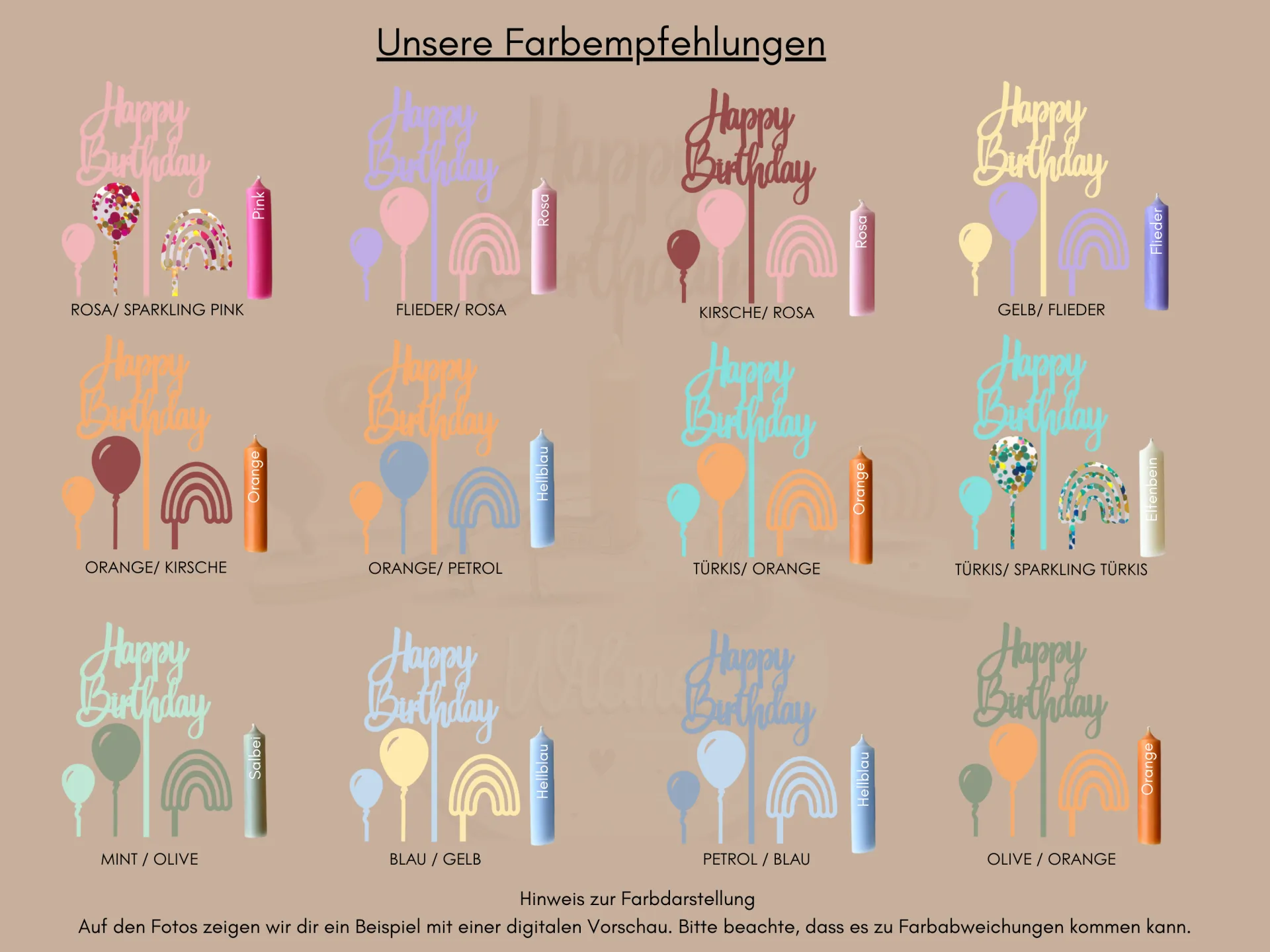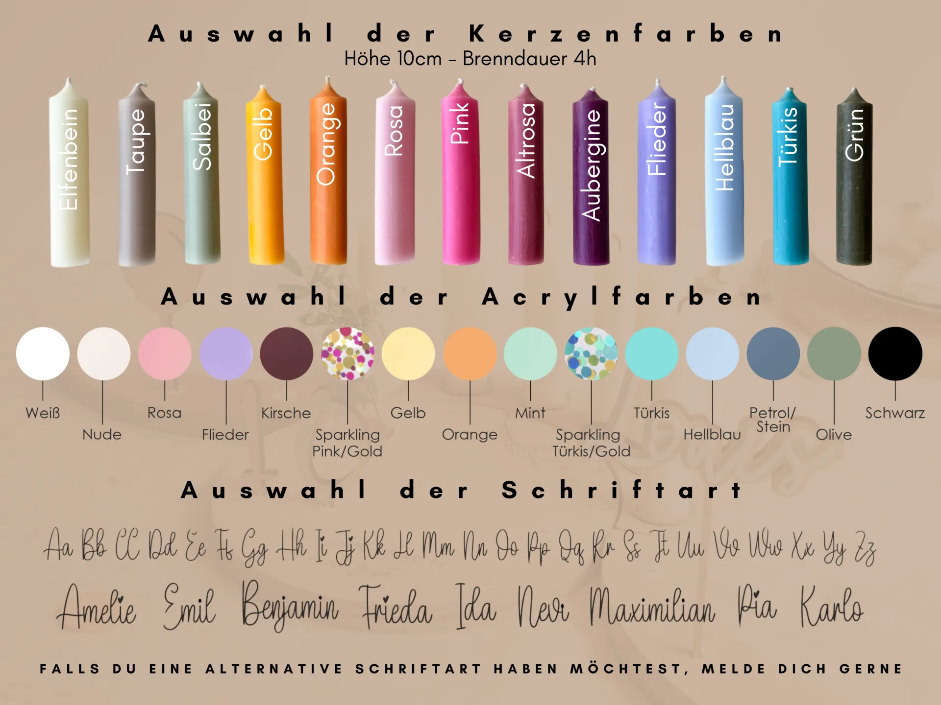 Du hast die Wahl aus 17 Acrylfarben für die Stecker und 13 Farben für deine Kerze. Ob pastellig, kräftig oder glitzernd – finde die Kombination, die perfekt zu deinem Kind und eurer Feier passt. Alternativ kannst du uns auch deine eigenen Farbwünsche mitteilen.