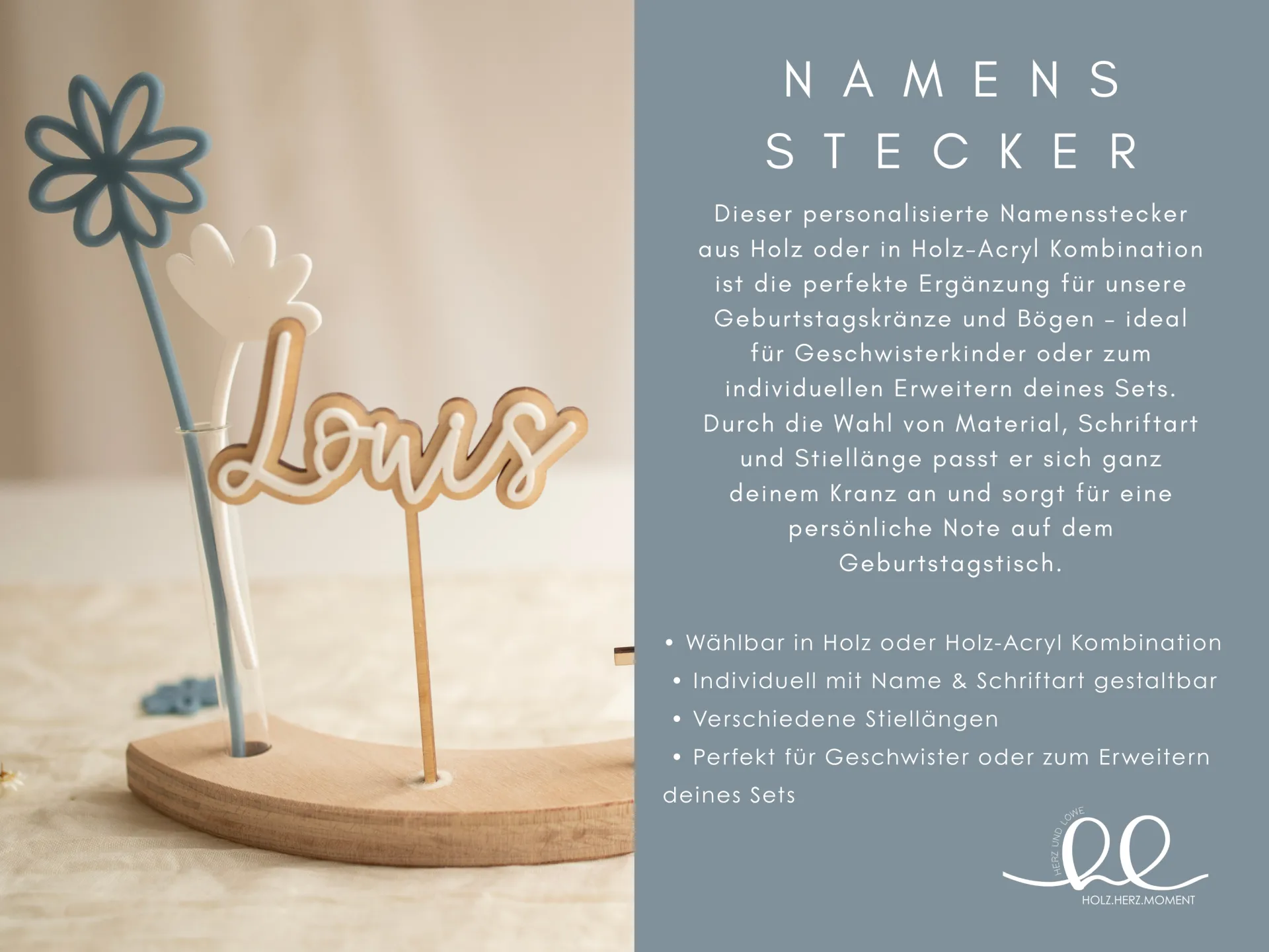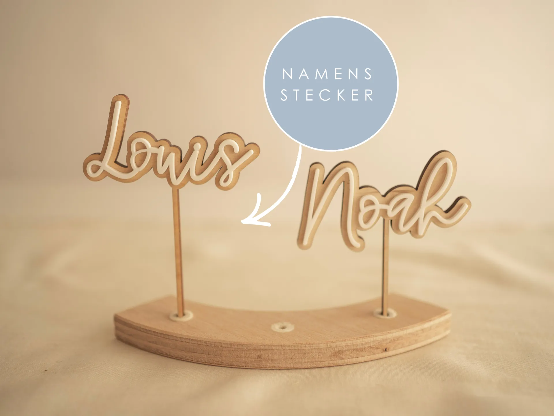 Unser Namensstecker macht deinen Kranz einzigartig – denn nichts ist persönlicher als ein Name. Besonders schön: Er eignet sich perfekt für Geschwisterkinder oder als Ergänzung, wenn bereits ein Kranz vorhanden ist. Der personalisierte Namensstecker wird so zum liebevollen Mittelpunkt deiner Dekoration.