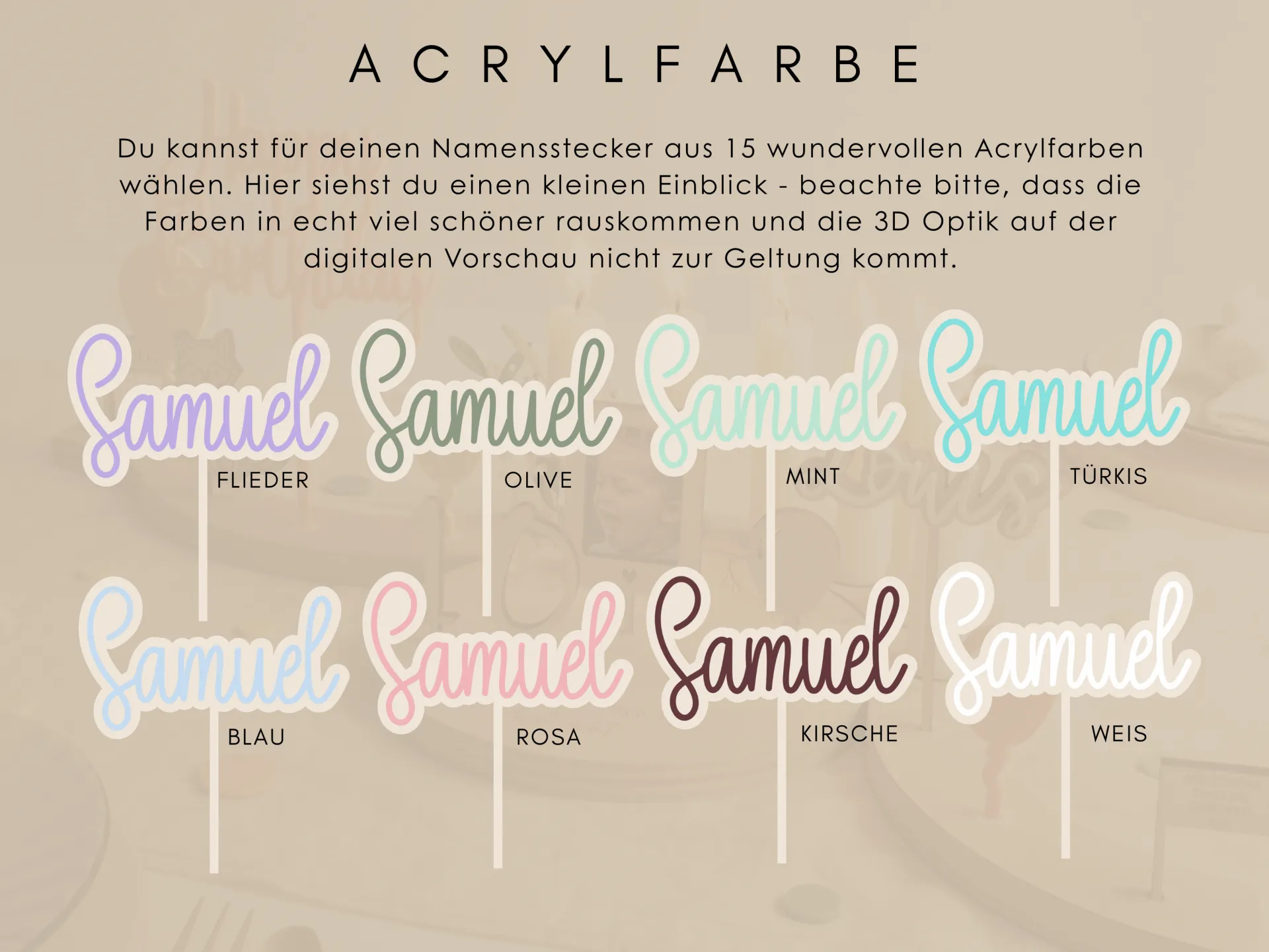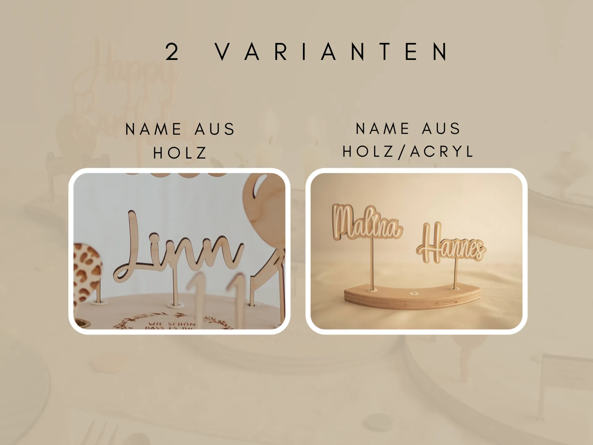Jeder Name für den Geburtstagskranz wird in einer besonderen 3D-Optik gefertigt: Der Schriftzug aus Acryl wird präzise auf einen Holzuntergrund geklebt. Das sorgt nicht nur für eine edle Optik, sondern macht den Stecker auch besonders stabil und langlebig. So entsteht ein hochwertiger Name aus Holz/Acryl, der viele Jahre Freude bereitet.