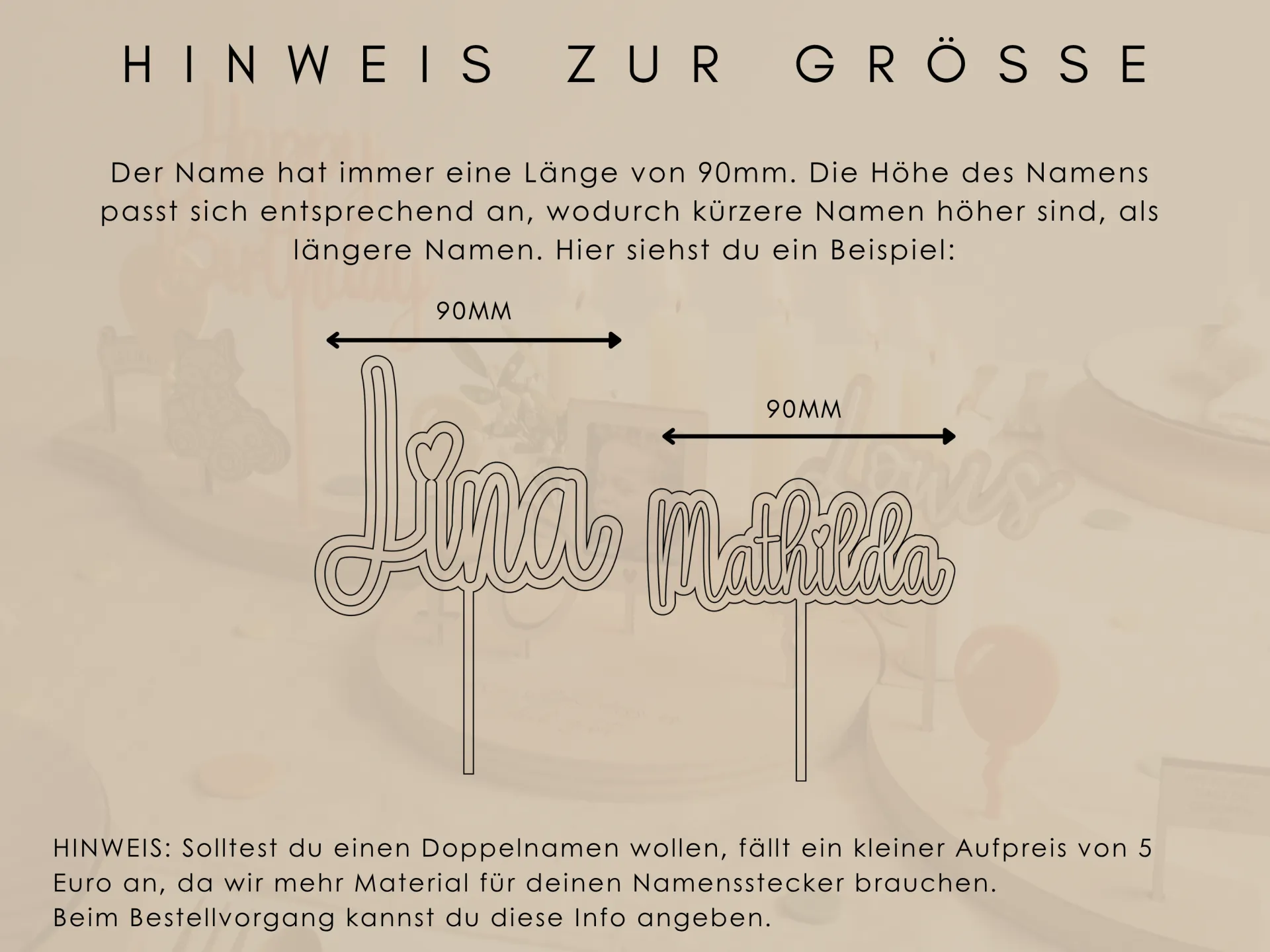 Der Name hat immer eine Breite von 90 mm, wodurch sich die Höhe automatisch ergibt: Kürzere Namen wirken höher, längere etwas filigraner. Doppelnamen werden untereinander gesetzt (gegen Aufpreis), was im Bestellprozess einfach ausgewählt werden kann.