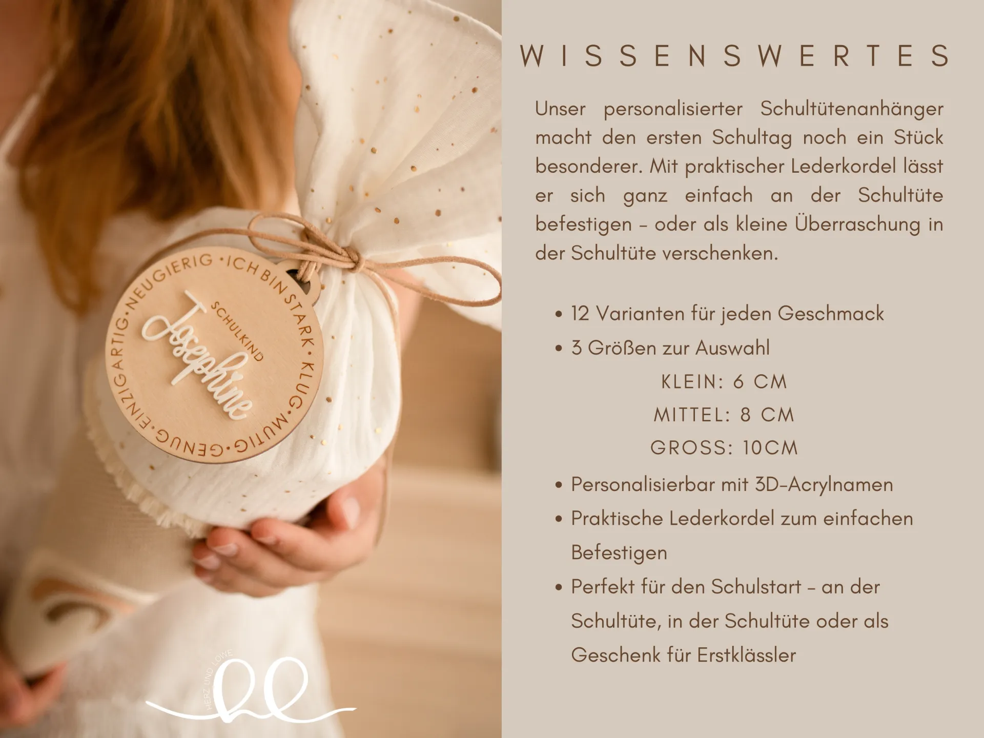 Mach den ersten Schultag deines Kindes zu etwas Besonderem mit unserem einzigartigen Schultütenanhänger mit Namen oder positiver Affirmation. Diese liebevoll gestalteten Holzanhänger zur Einschulung sind in drei verschiedenen Größen und vier bezaubernden Designs erhältlich, sodass für jeden Geschmack etwas dabei ist.