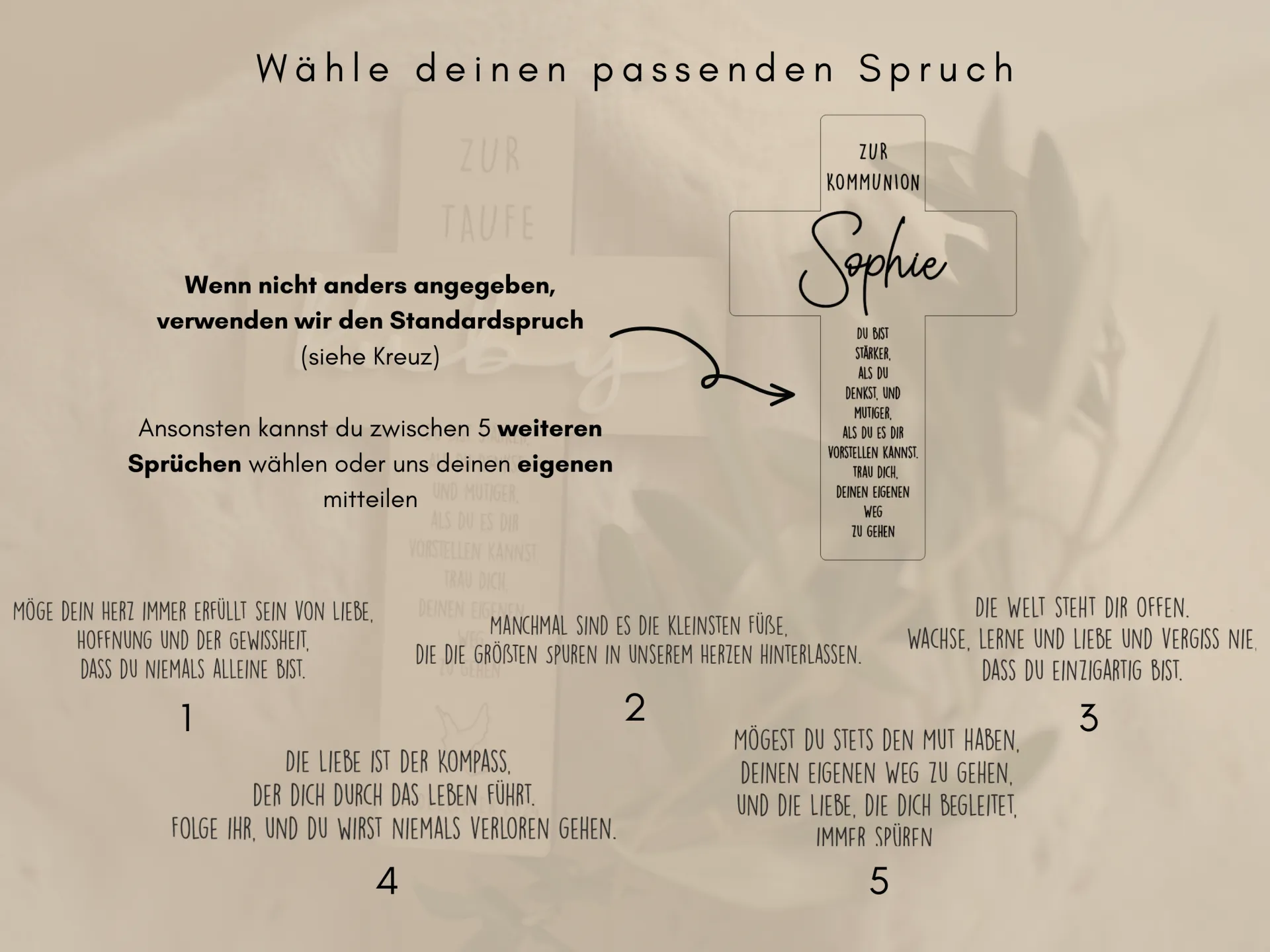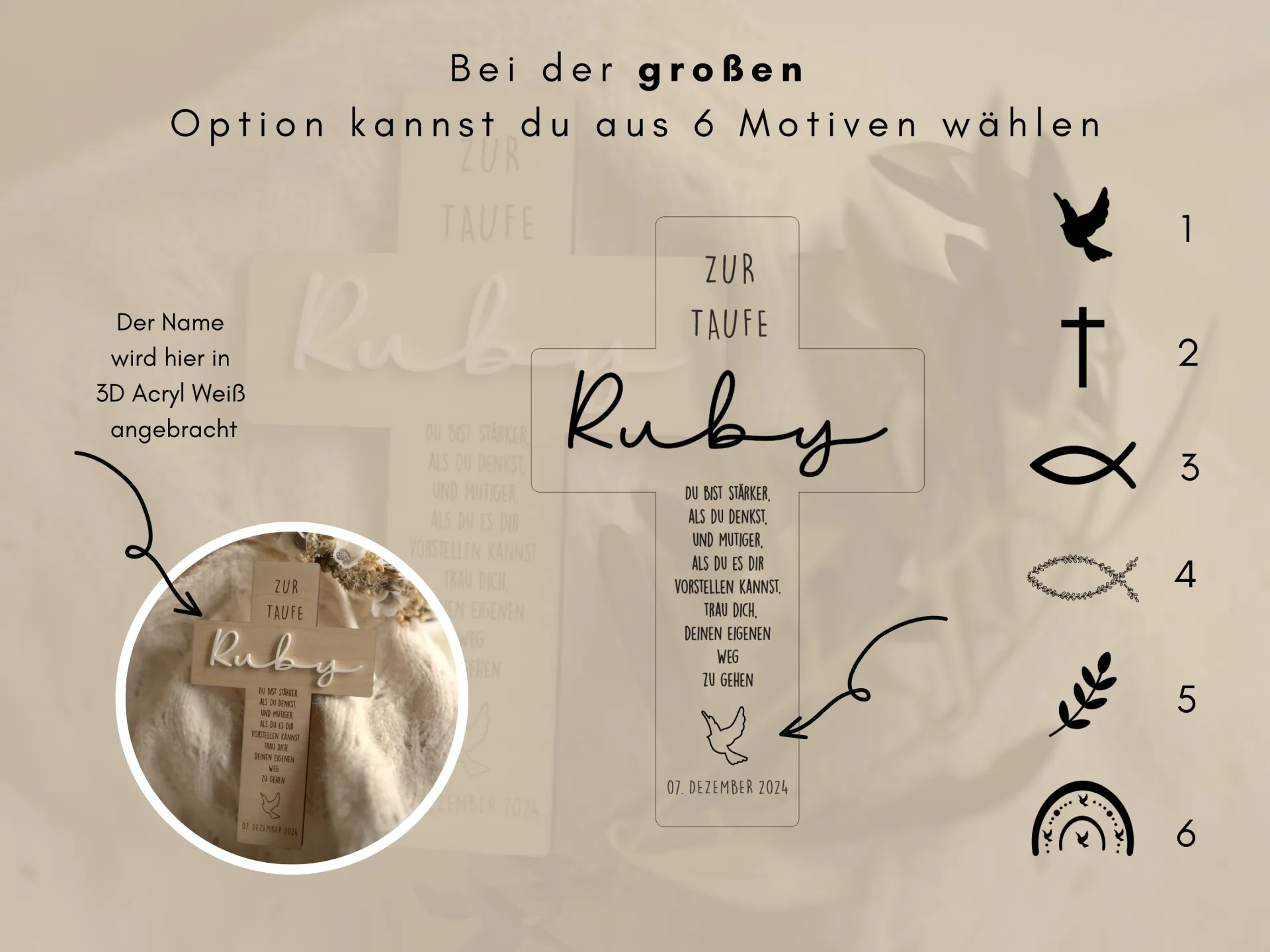 Gestalte dein Kreuz mit einer persönlichen Note: Wähle aus sechs inspirierenden Sprüchen oder formuliere deine eigene Botschaft, die von Herzen kommt. Auf dem großen Kreuz kannst du zusätzlich eines von sechs Symbolen (Taube, Fisch, Kreuz, Regenbogen, Blatt) auswählen, um dem Design eine besondere Bedeutung zu geben. Der Name wird aus hochwertigem 3D-Acryl in Weiß gefertigt, auf Wunsch auch in einer anderen Farbe.