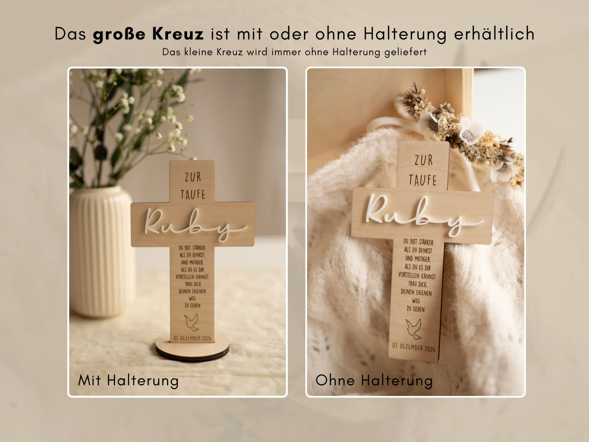 Stell dir vor, wie das Kind oder die Eltern das individuell gestaltete Taufkreuz personalisiert aus Holz auspacken – mit eingraviertem Namen und einem liebevoll gewählten Spruch. Ob als Geschenk für dein Patenkind, von Großeltern oder engen Freunden – diese Geste bleibt in Erinnerung. Das Kreuz kann als Dekoration im Kinderzimmer aufgestellt werden oder an der Wand angebracht werden oder aber auch einen Platz in einer Erinnerungskiste bekommen und begleitet das Kind ein Leben lang.