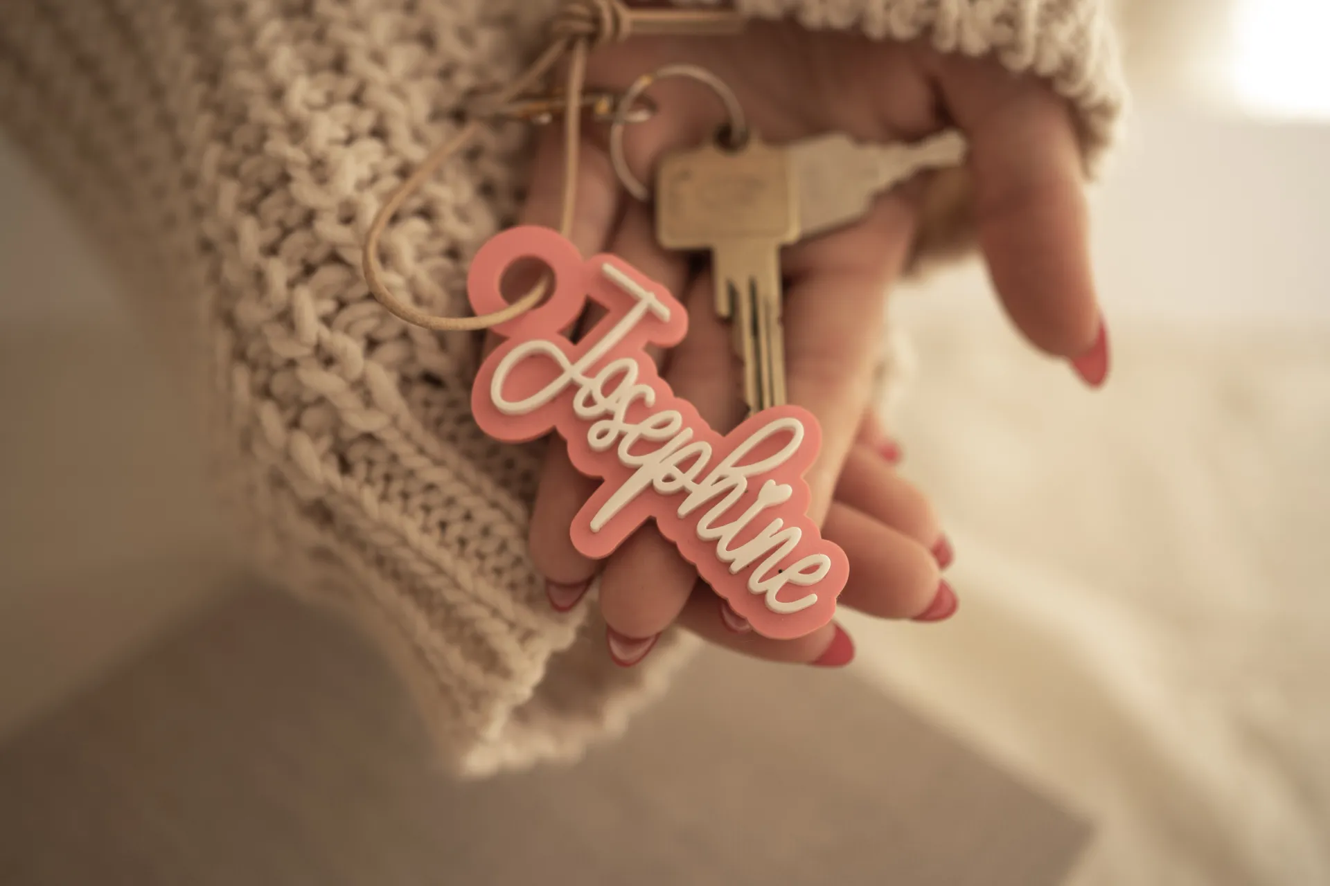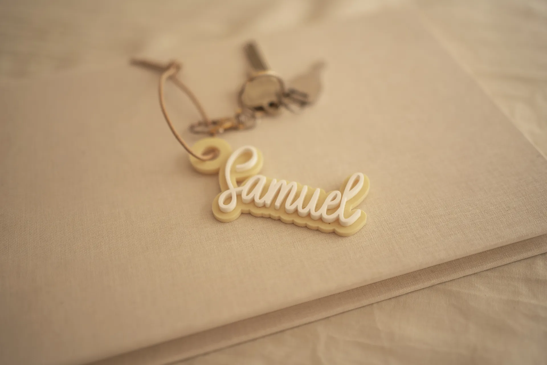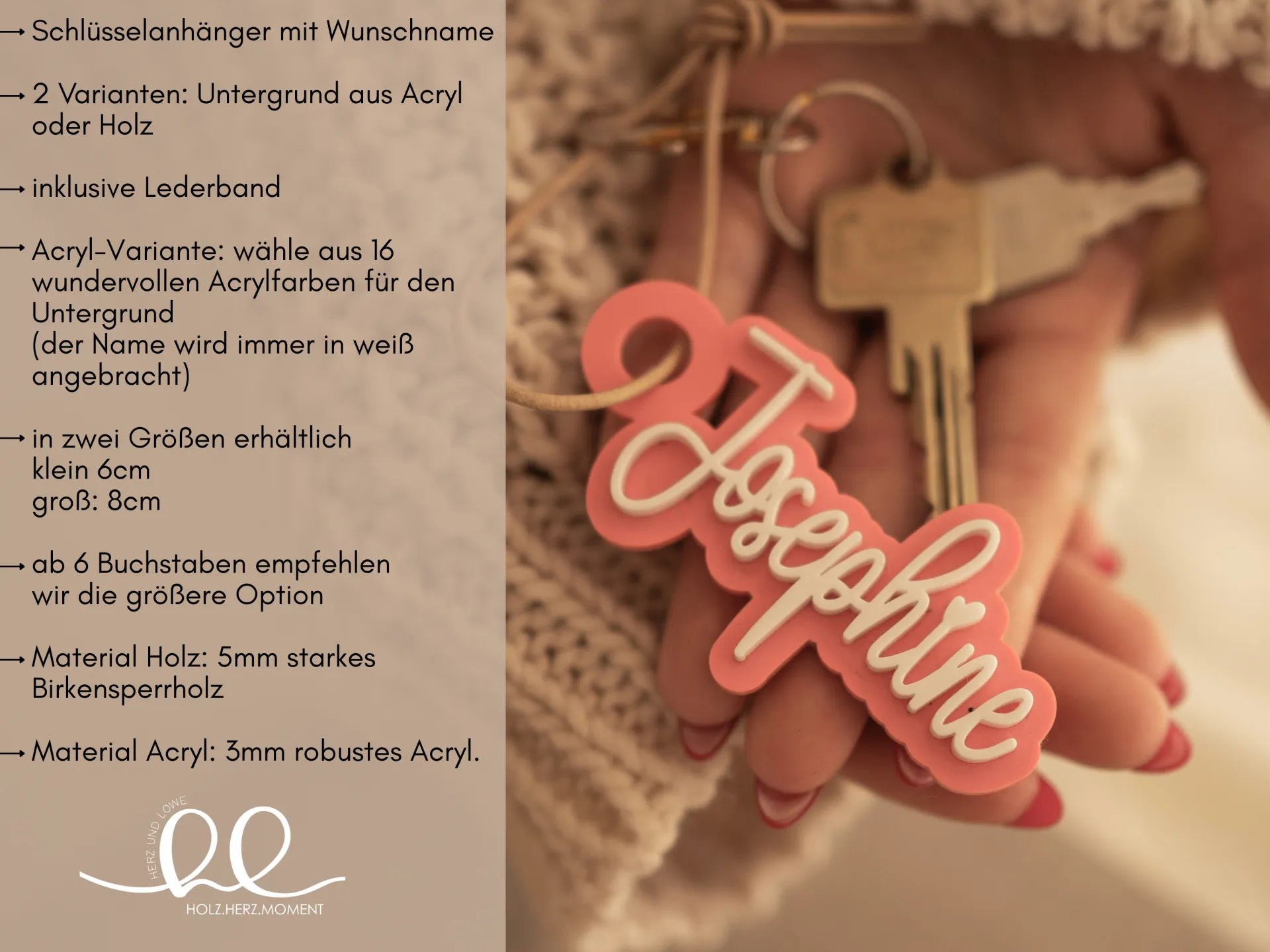 Dein individuelles Andenken – Personalisierter Schlüsselanhänger mit Bedeutung Jedes Stück ist ein Unikat – mit Sorgfalt gefertigt und mit Liebe zum Detail. Die 3D-Schrift in Weiß hebt sich sanft vom gewählten Hintergrund ab und macht den Namen greifbar.