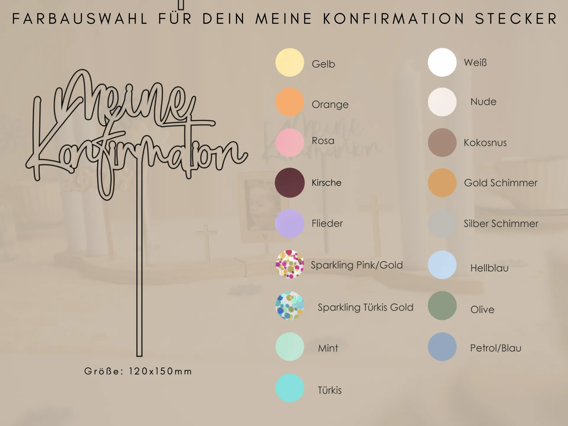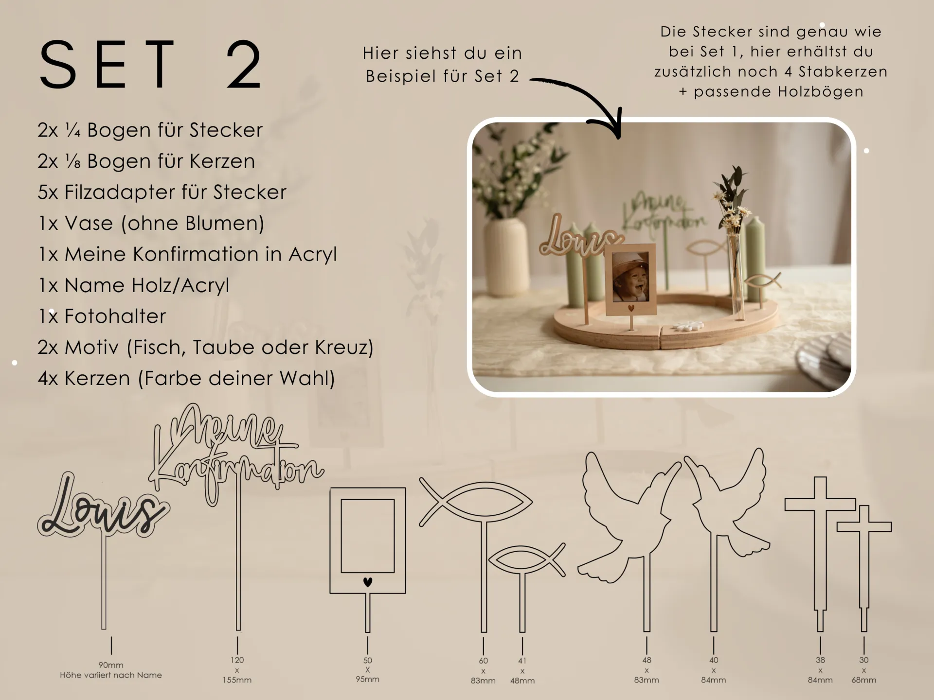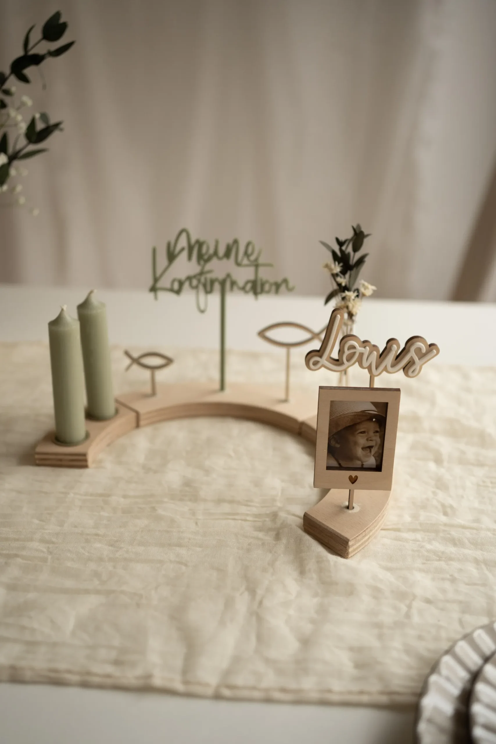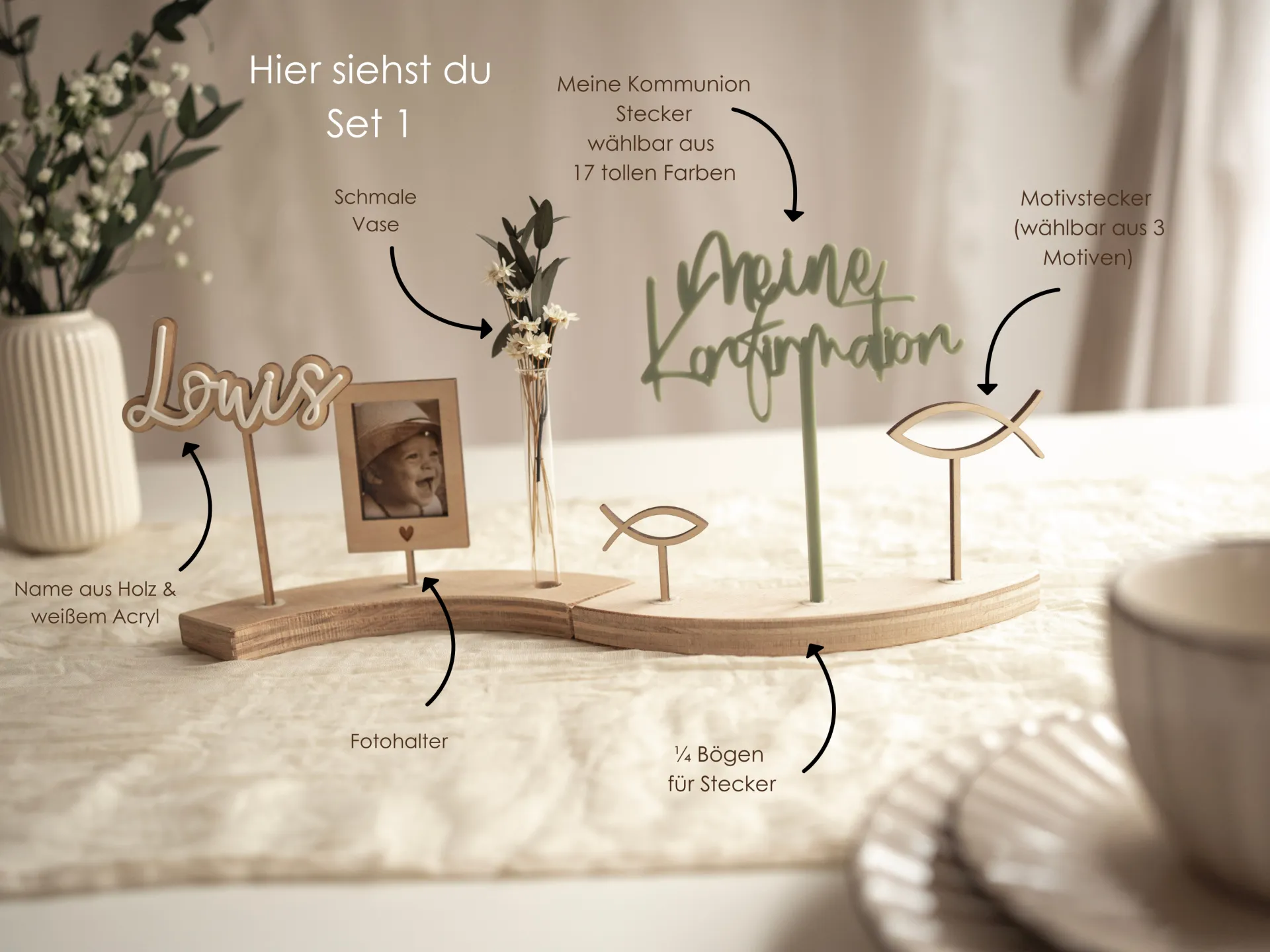 Das Set enthält alles, was du für eine stilvolle und persönliche Tischdekoration zur Konfirmation benötigst. Ein hochwertiger Acrylstecker im Schriftzug „Meine Konfirmation“, den du in einer von 17 wunderschönen Farben wählen kannst, bildet das Highlight. Dazu kommt ein personalisierter Namensstecker aus 5mm Birkensperrholz, verziert mit einer weißen Acrylapplikation – und fertig ist das besondere Etwas auf der Kuchentafel der Kommunion.