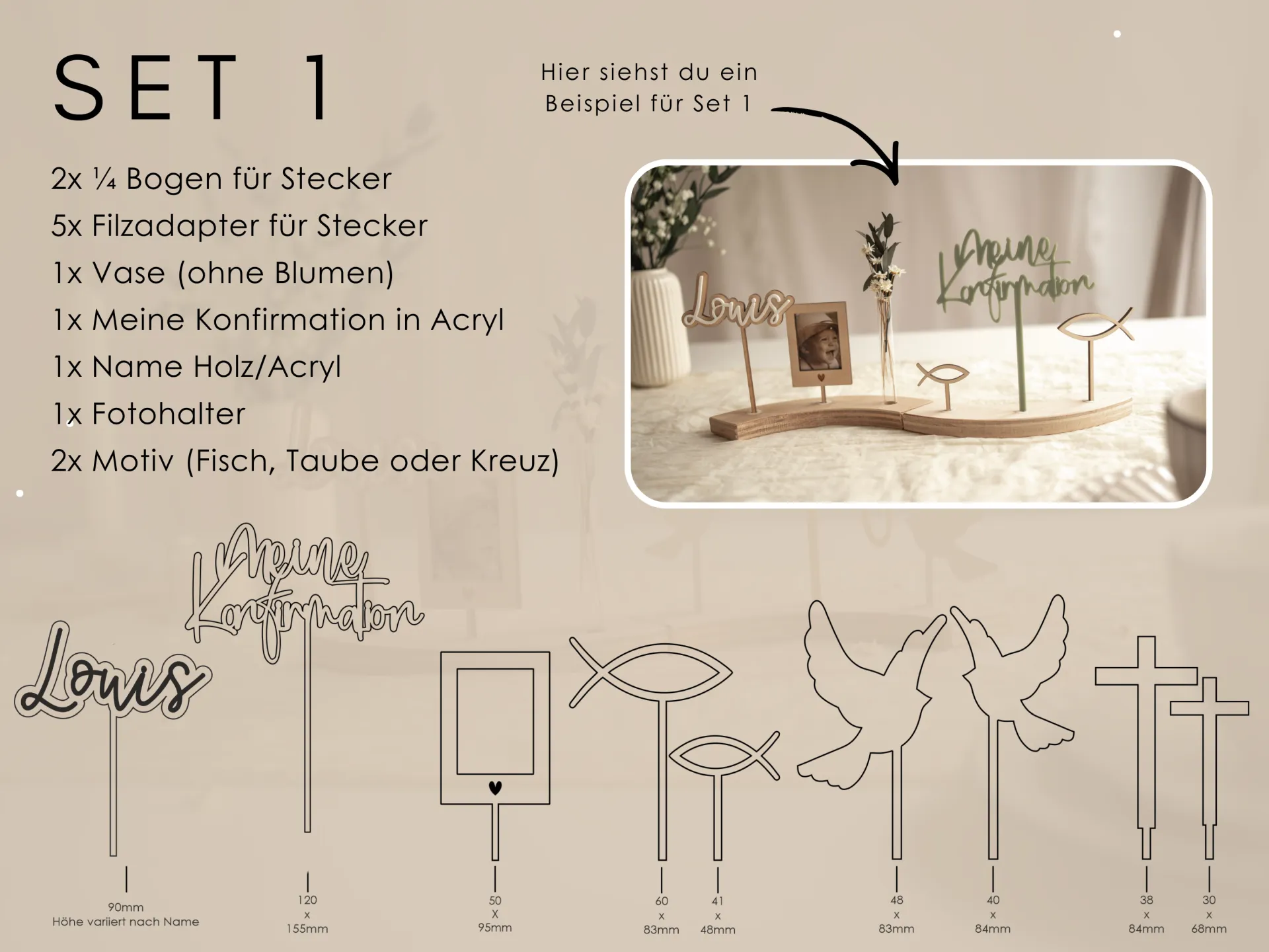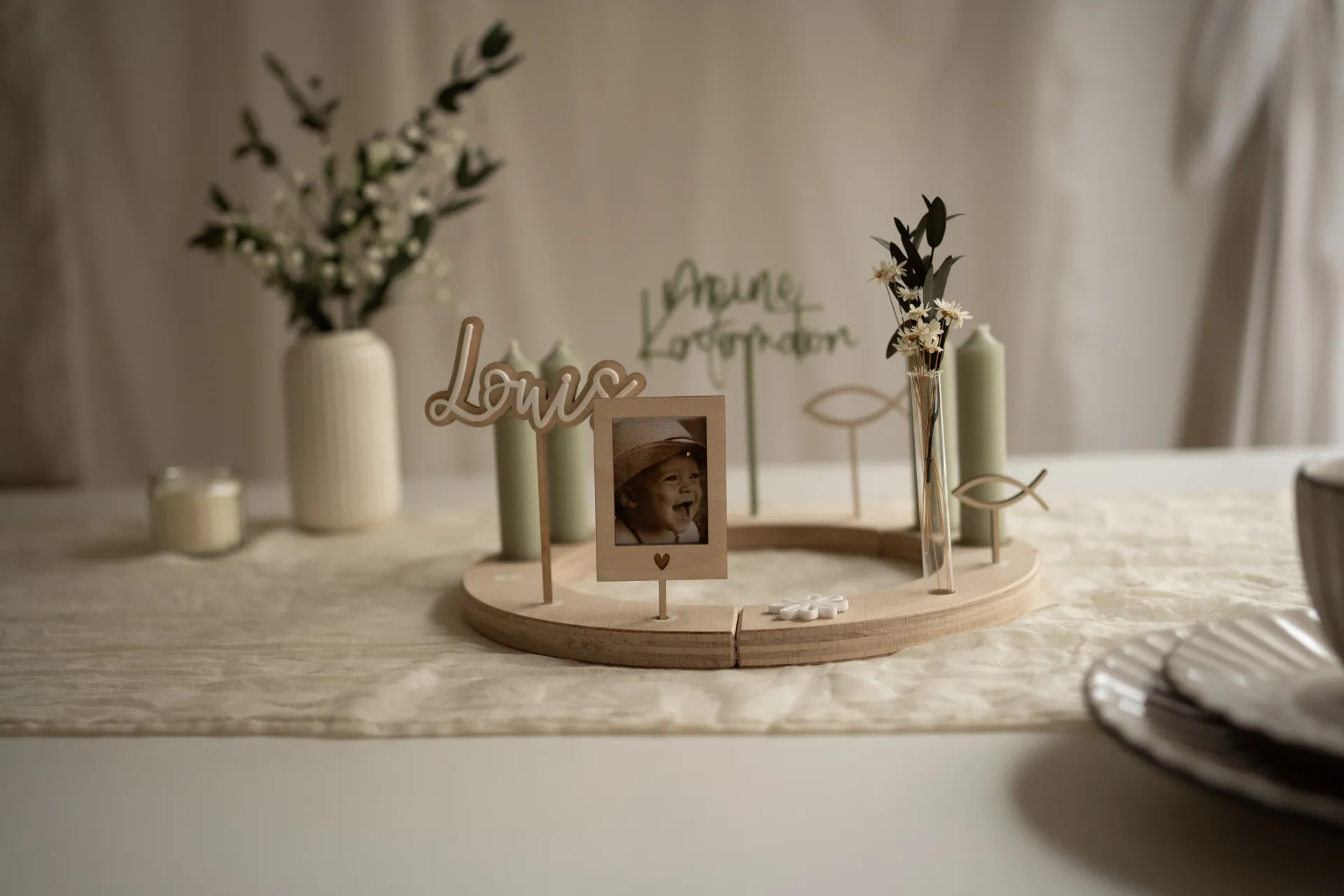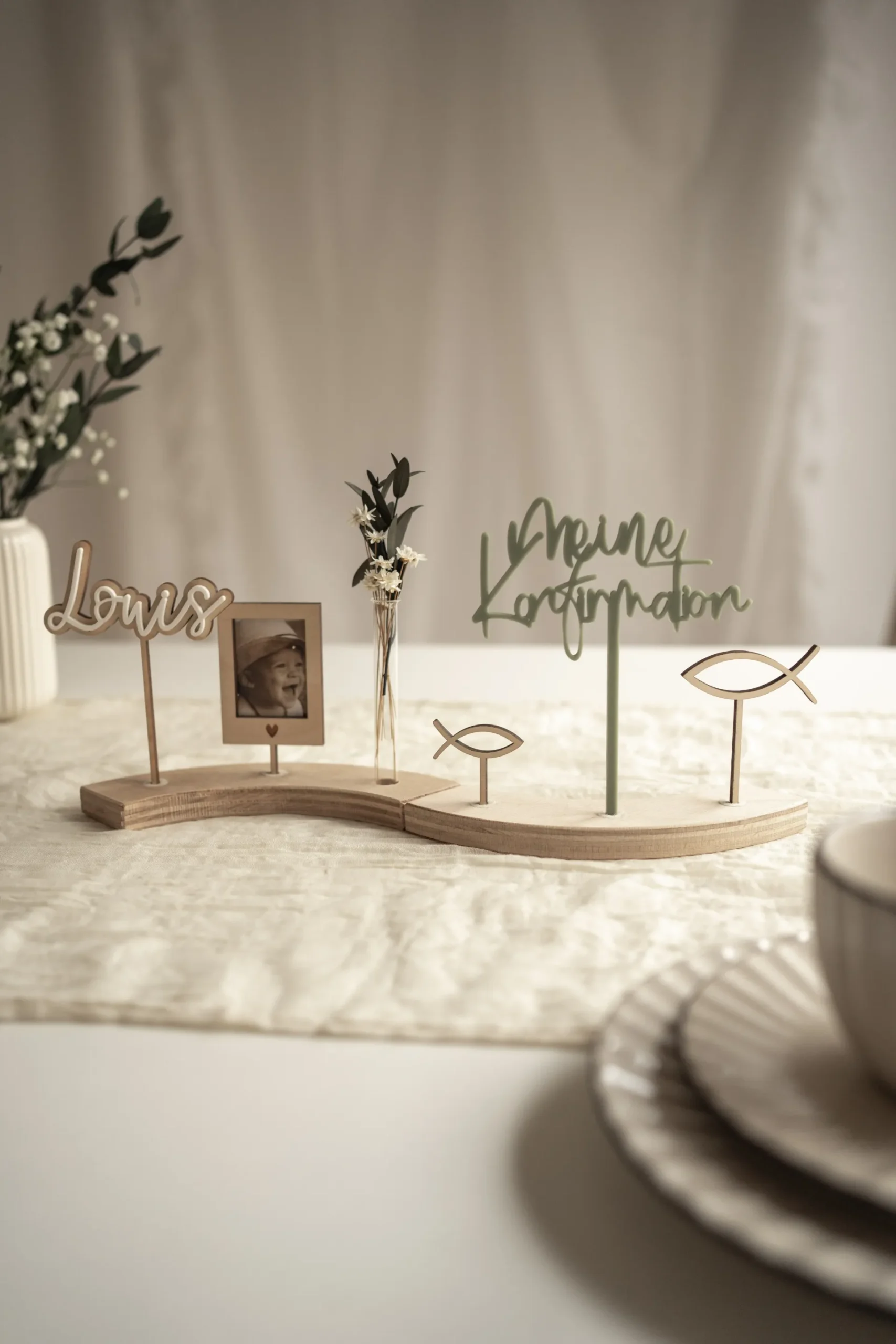Eine schlichte Vase bietet Platz für Blumen oder andere kreative Dekorationsideen und fügt der Tafel einen natürlichen Akzent hinzu. Mit einem Fotohalter kannst du ein schönes Bild des Konfirmanden in Szene setzen und so den Tisch noch persönlicher gestalten. Abgerundet wird das Set durch zwei symbolträchtige Motivstecker, bei denen du zwischen einer Taube, einem Fisch oder einem Kreuz wählen kannst.