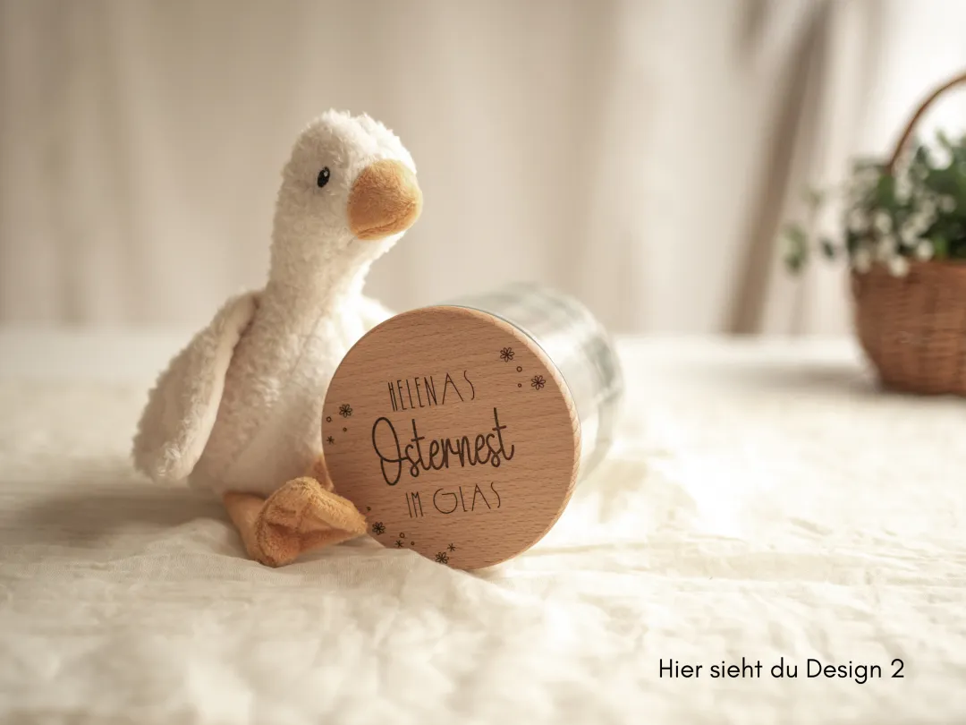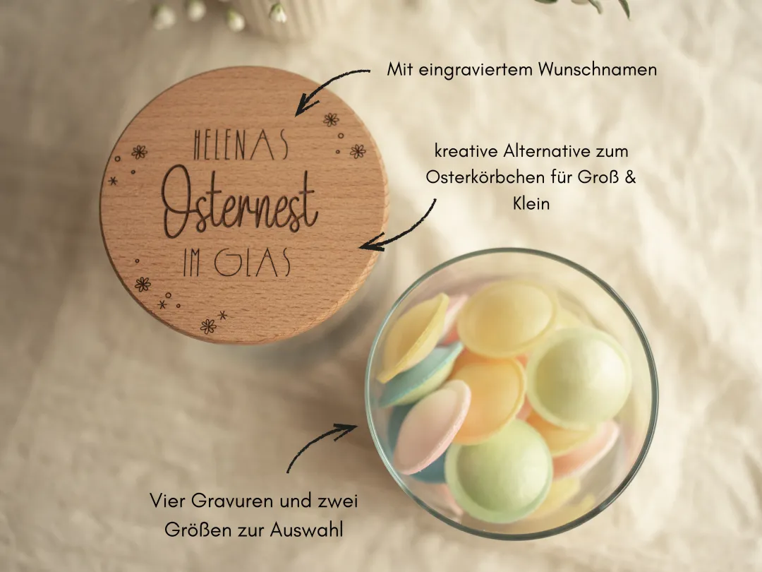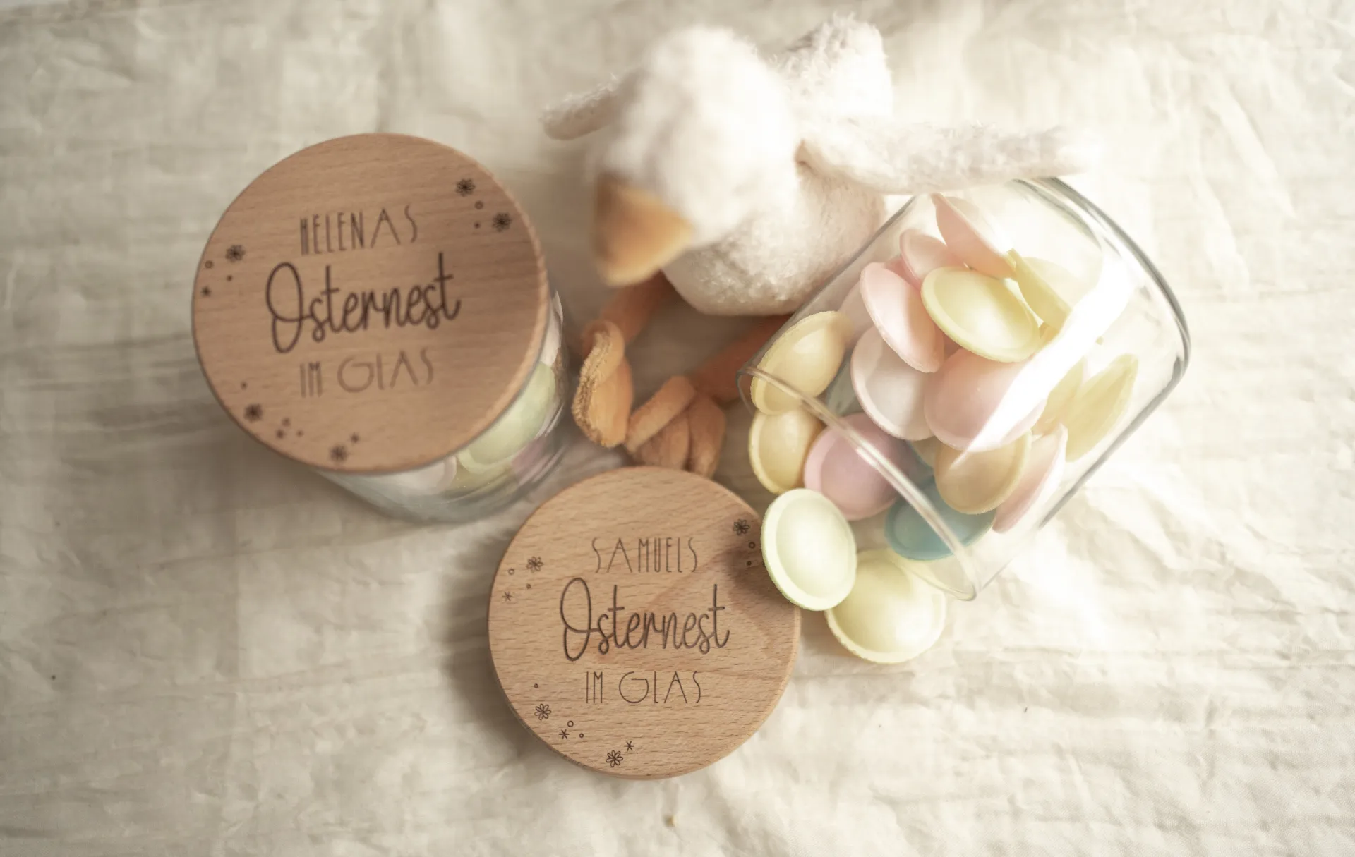 Stell dir vor, wie dein Kind voller Vorfreude sein personalisiertes Osternest im Glas öffnet und den eigenen Namen oder ein süßes Motiv auf dem Deckel entdeckt. Dieser Moment macht das Osternest zu etwas ganz Besonderem und sorgt für strahlende Kinder Augen. Ein liebevolles Geschenk, das mit individueller Gravur eine persönliche Botschaft übermittelt und Wertschätzung zeigt.