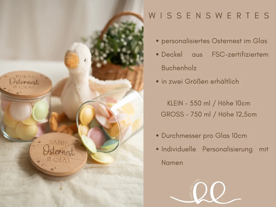 Nach Ostern wird dein personalisiertes Osternest im Glas zu einem praktischen Alltagshelfer. Ob als Vorratsglas für Leckereien, zur Aufbewahrung kleiner Schätze oder als dekoratives Element im Kinderzimmer – dank der hochwertigen Verarbeitung wirst du lange Freude daran haben.